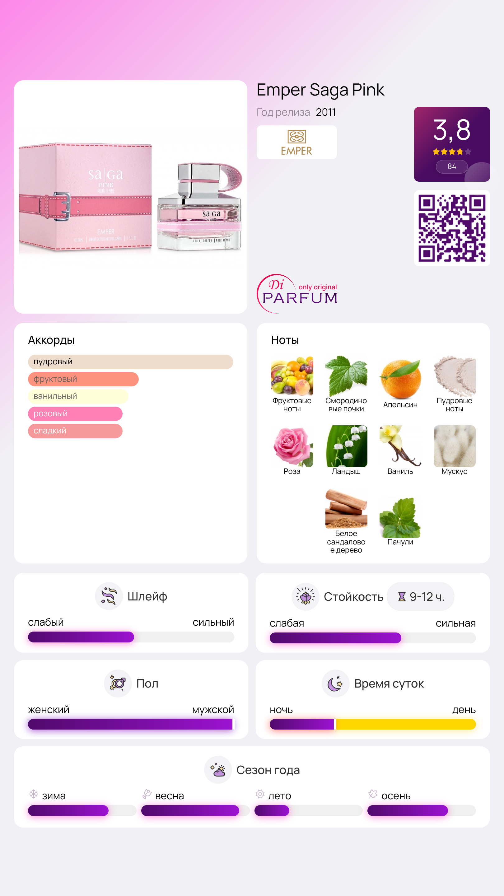 Saga Pink от Emper — это изысканный цветочно-фруктовый аромат, созданный специально для современных женщин. Он открывается яркими фруктовыми нотами, в которые гармонично вплетаются свежие ноты черной смородины и апельсина, создавая ощущение легкости и радости.