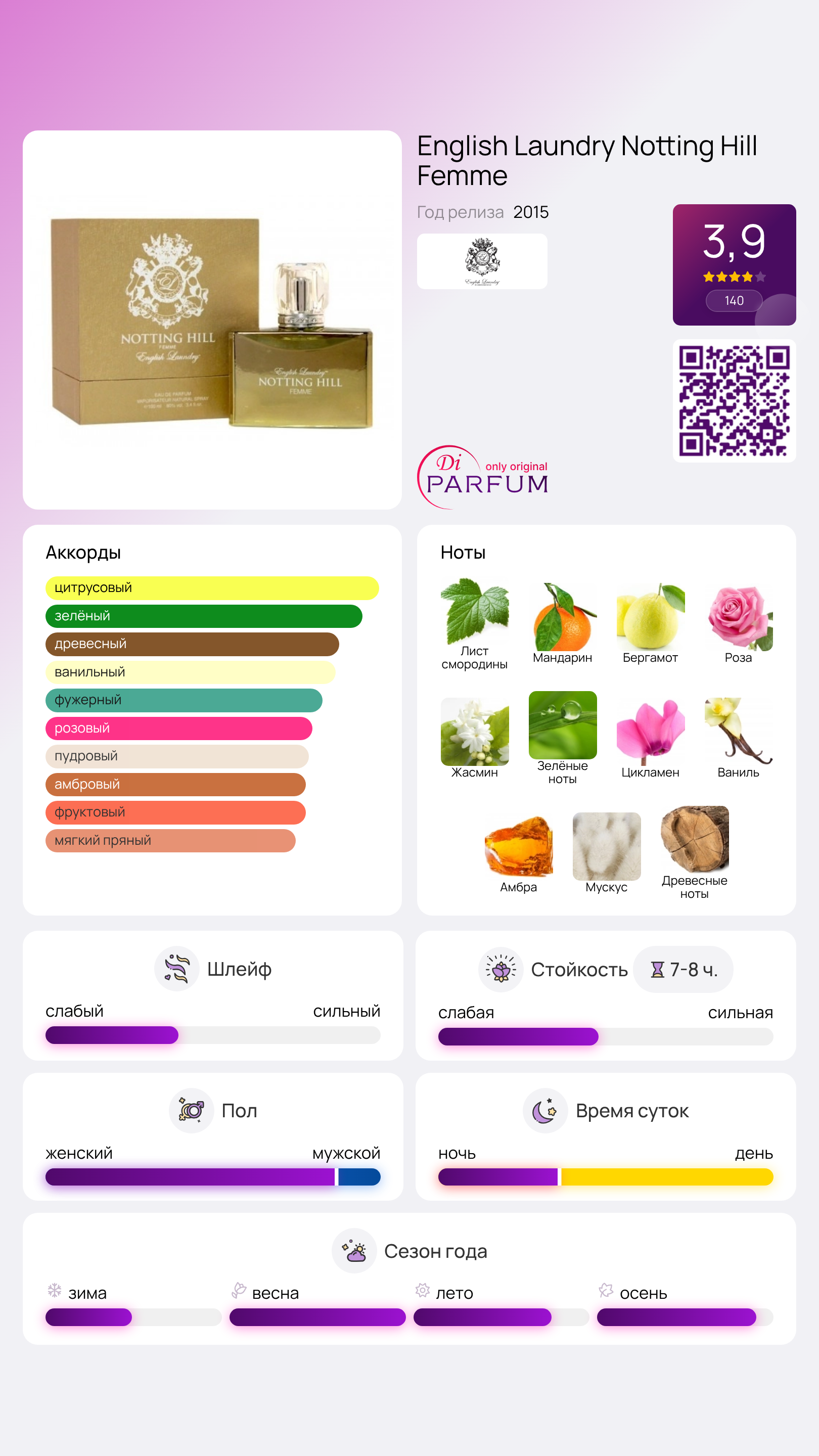 Парфюмерная структура English Laundry Notting Hill Femme отличается сложностью и изяществом. Каждая нота ароматического треугольника гармонично сочетается с соседней, создавая неповторимый и неожиданно красивый аккорд. Композиция начинается с ярких и смелых цитрусово-ягодных оттенков, где роскошная черная смородина находит своё место среди горьковатого бергамота и сочного мандарина. Это тройное сочетание, источающее энергетику, постепенно уступает место цветочно-зелёным нотам сердца, где самодостаточная роза гармонирует с нежным жасмином и изысканным цикламеном.