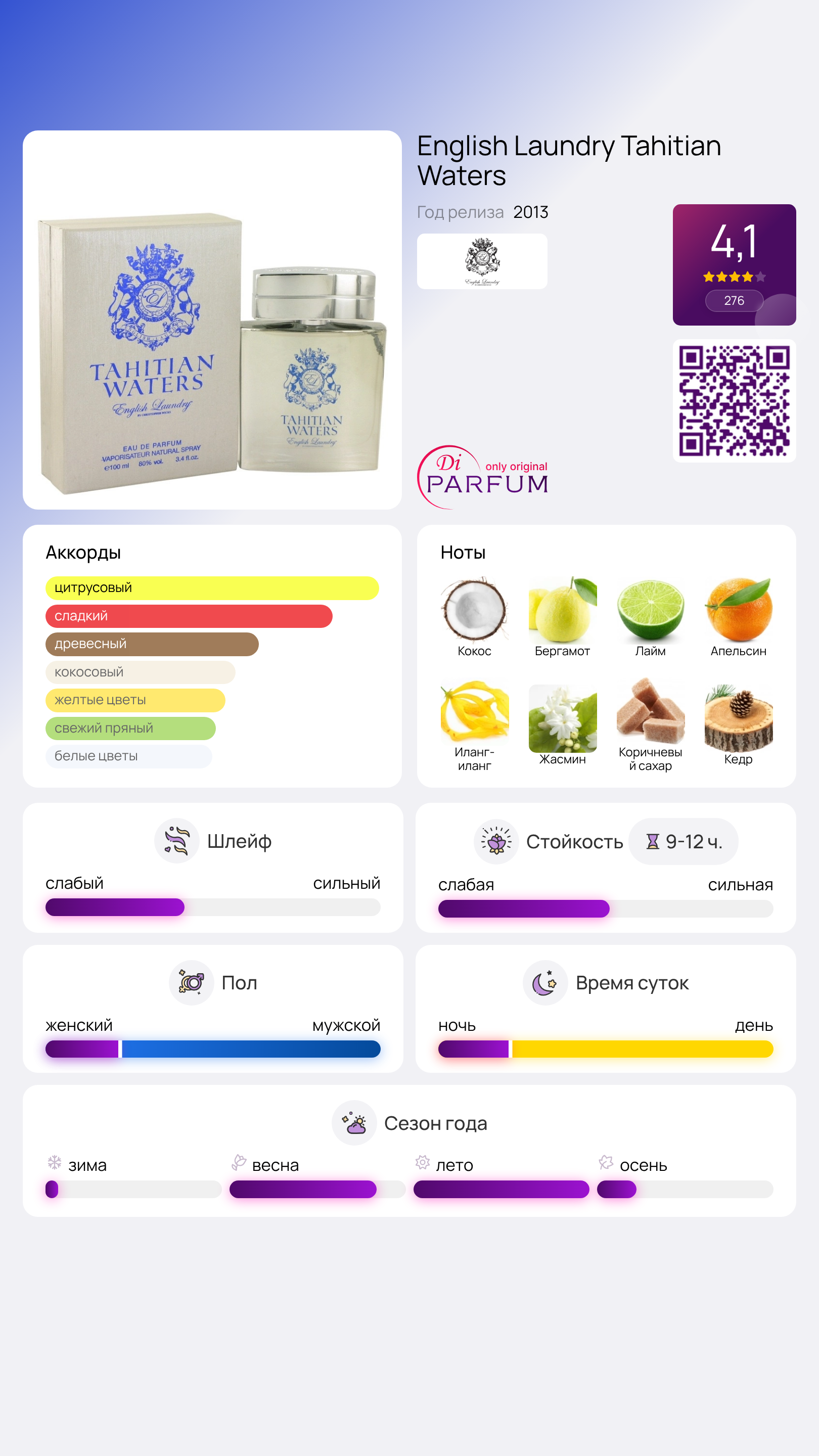 В 2013 году английский парфюмерный бренд English Laundry порадовал любителей сладких цветочно-фруктовых ароматов своим великолепным парфюмом под названием Tahitian Waters. Эта настоящая гурманская композиция быстро завоевала популярность среди ценителей и стала настоящей классикой стиля.