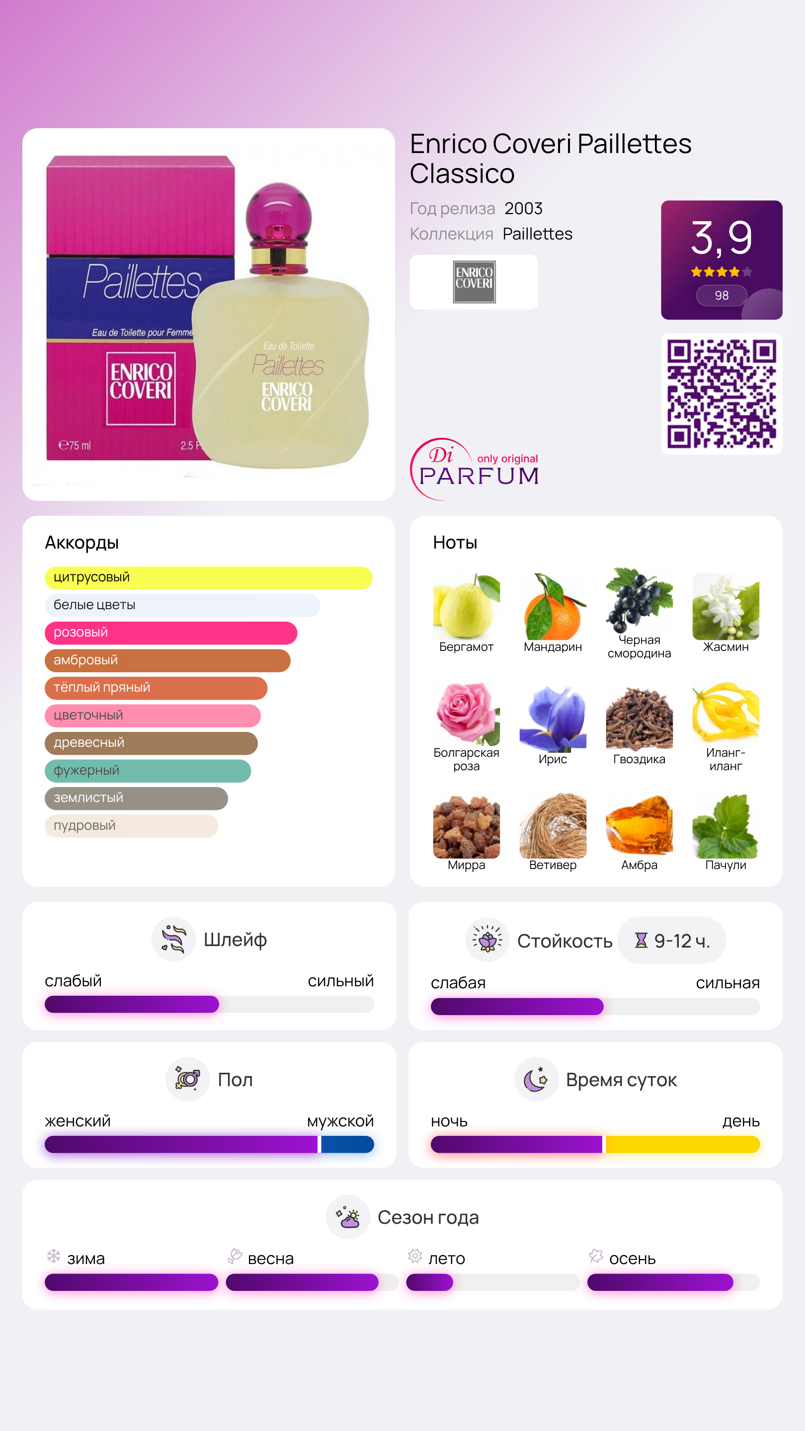 Элегантный аромат Paillettes Classico от Enrico Coveri был выпущен в 2003 году итальянским брендом, который начал завоевывать мир моды с момента своего дебюта на парижских подиумах в 1997 году.