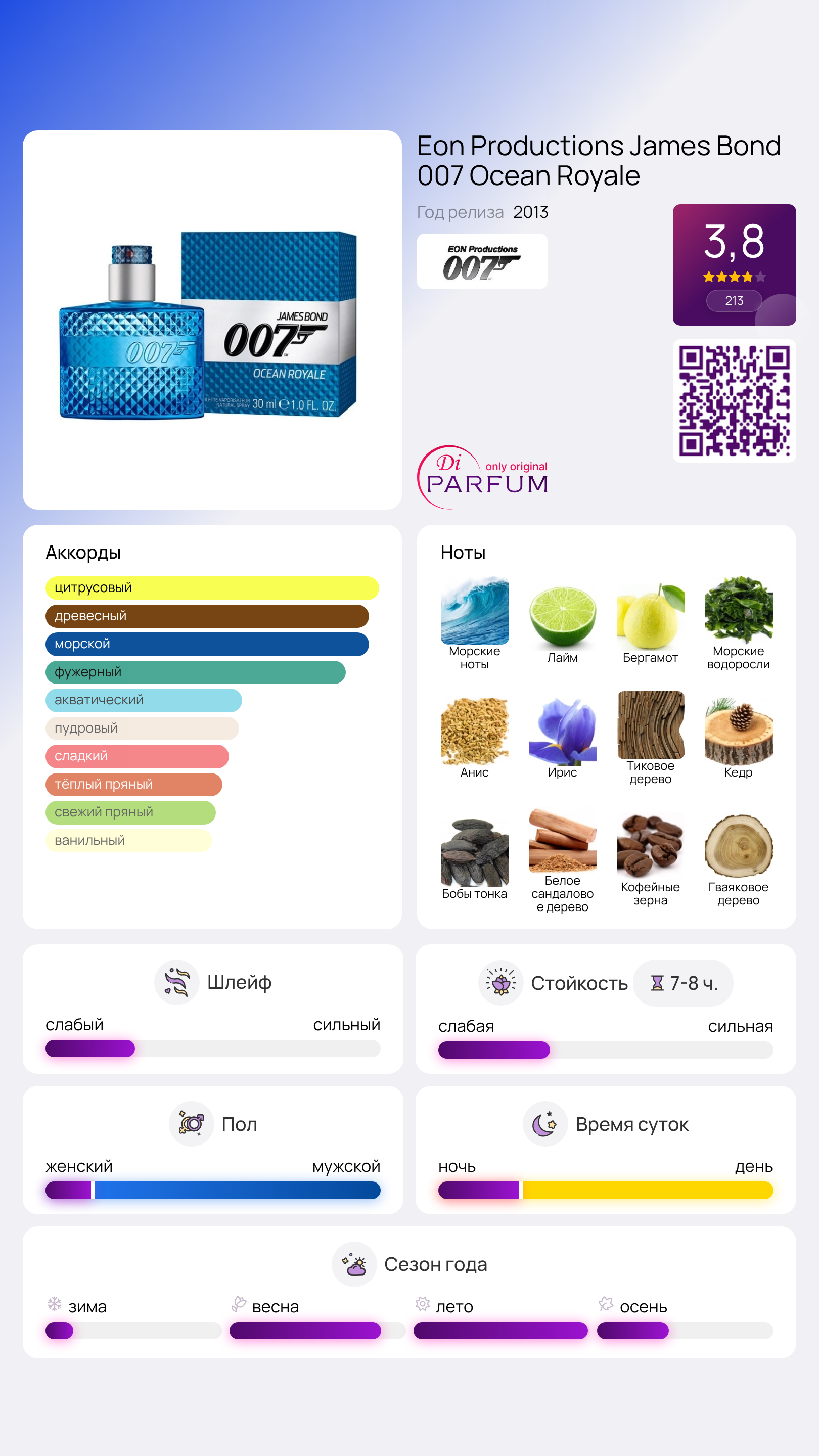 Парфюм Eon Productions James Bond 007 Ocean Royale раскрывается с ярких и бодрящих нот бергамота и лайма, к которым добавляется анисовая пряность и легкий привкус морских водорослей.