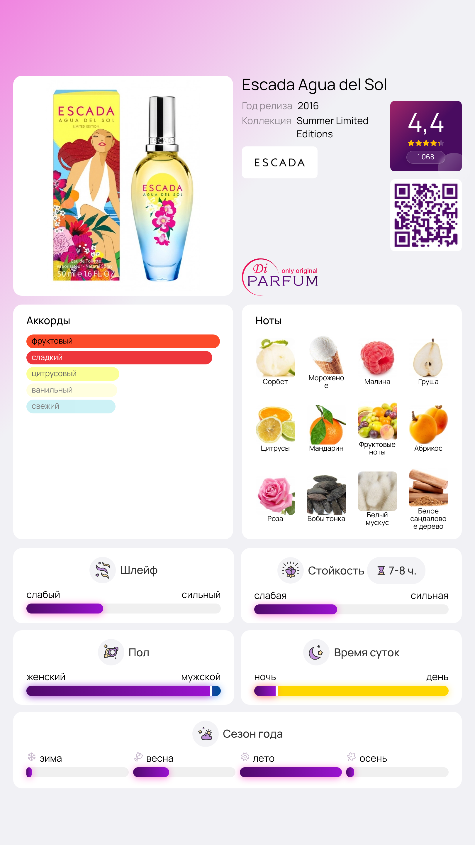 Agua del Sol – это женский аромат, представляющий собой цветочно-фруктовую композицию от известного бренда Escada. Парфюм стал символом летнего сезона 2016 года и обещает подарить незабываемые впечатления. Как и все ароматы данной марки, Agua del Sol отличается игривой и легкой атмосферой, что сделает его любимым выбором для молодежной аудитории.