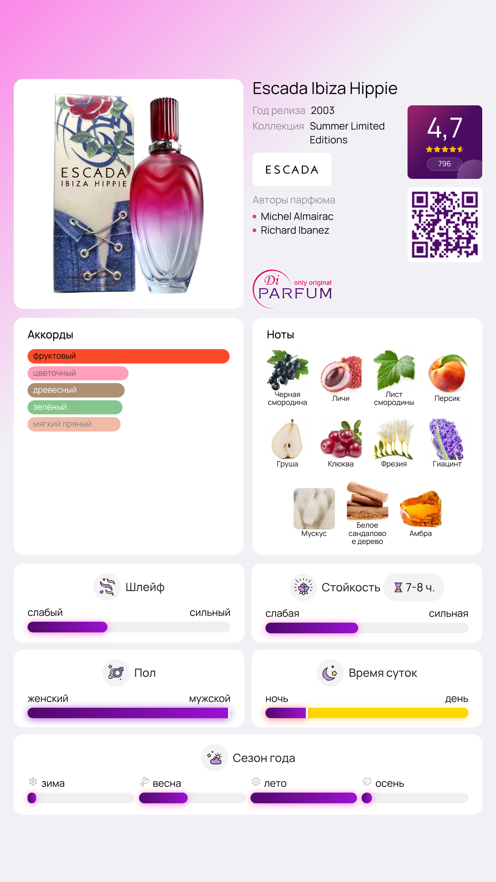 В основе Ibiza Hippie — дерзкий фруктовый букет с добавлением мускуса и легким сладким оттенком, напоминающим конфеты. Аромат включает в себя ноты груши и черной смородины, дополненные личи и голубой фрезией, что придает ему свежесть и необычность. Клюква и амбра добавляют игривости и немного озорства, в то время как мускус и страстоцвет вносят нотки женственности и утонченности.