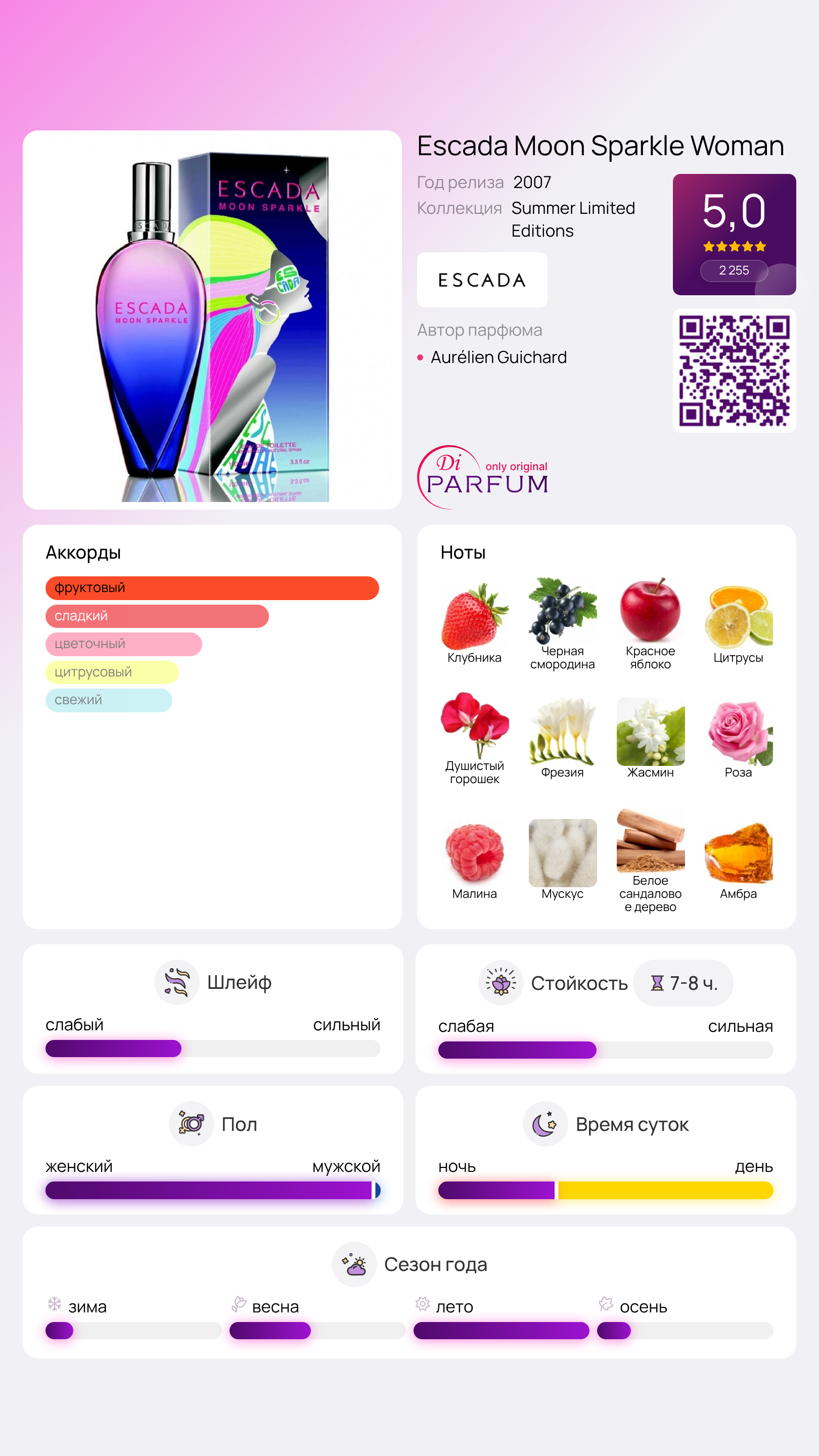 Аромат Moon Sparkle Woman от Escada, созданный для женщин, выглядит как будто специально разработан, чтобы подчеркнуть их нежность и уязвимость. В центре этой парфюмерной композиции преобладают чудесные, утонченные цветочные ноты, которые пробуждают воспоминания о тёплых летних днях и уютных вечерах. Сладко-фруктовые нотки душистого горошка гармонично сочетаются с великолепием розы и жасмина, а также с лёгкой свежестью фрезии.