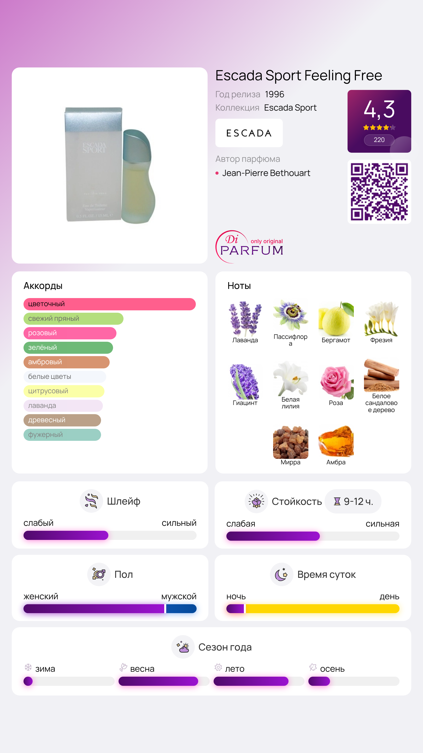 Универсальный аромат Sport Feeling Free от Escada отражает активный образ жизни, положительные эмоции и радость общения с природой. Выпущенный в 1996 году, этот цветочный зеленый парфюм сразу же завоевал популярность среди молодежи, и на протяжении многих лет продолжает пользоваться спросом, несмотря на разнообразие новых ароматов. Одно распыление этого парфюма обеспечит вам заряд бодрости на весь день.