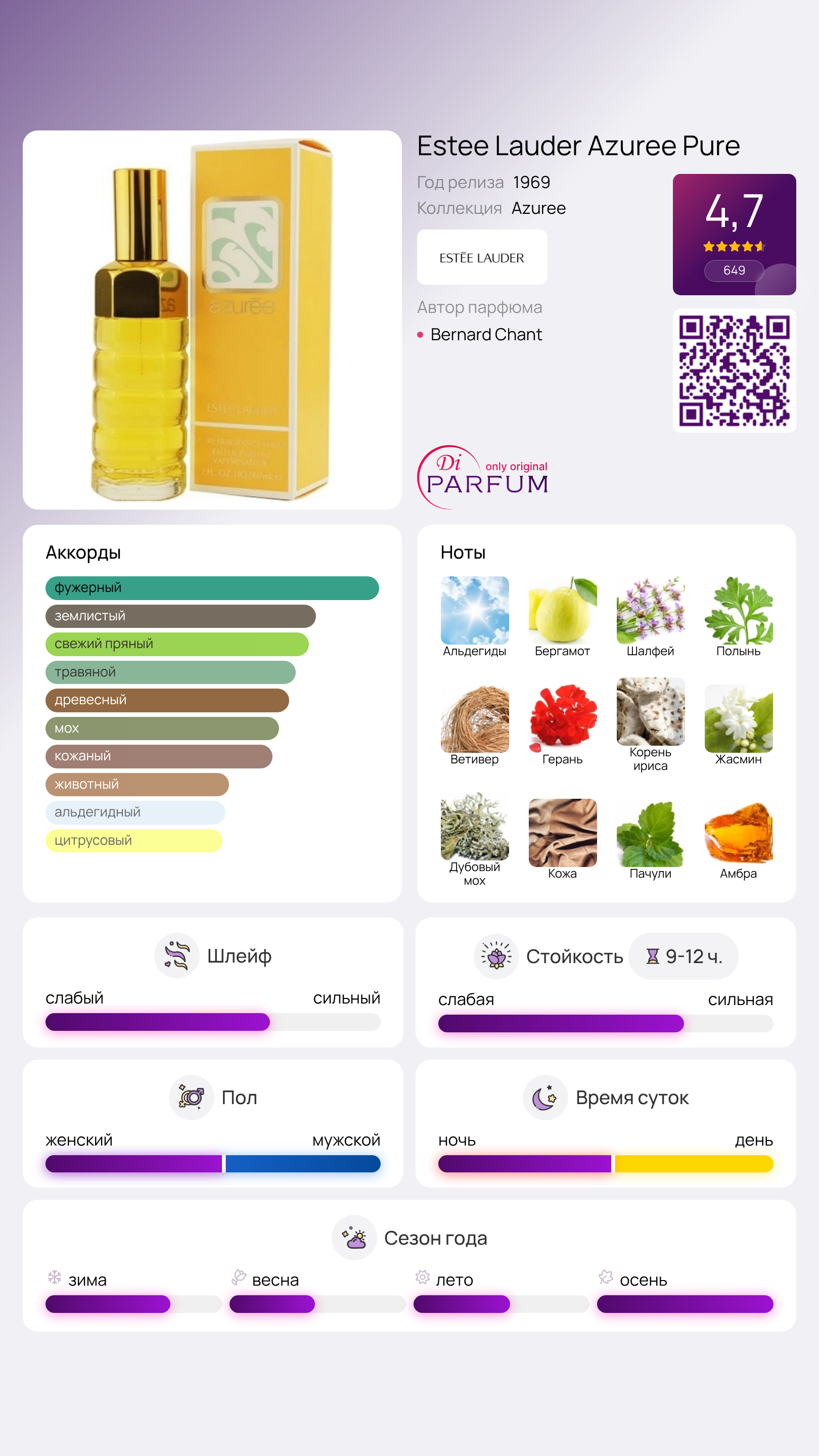 Винтажные ароматы, которые продолжают привлекать внимание и по сей день, безусловно, заслуживают признания. Azuree Pure – это восточный цветочный букет от Estee Lauder Parfum, впервые представленный публике в 1969 году. Его аромат вызывает ассоциации с ретро, начиная от нарядов из кримплена до причесок в стиле «Бабетта» и очков-бабочек.