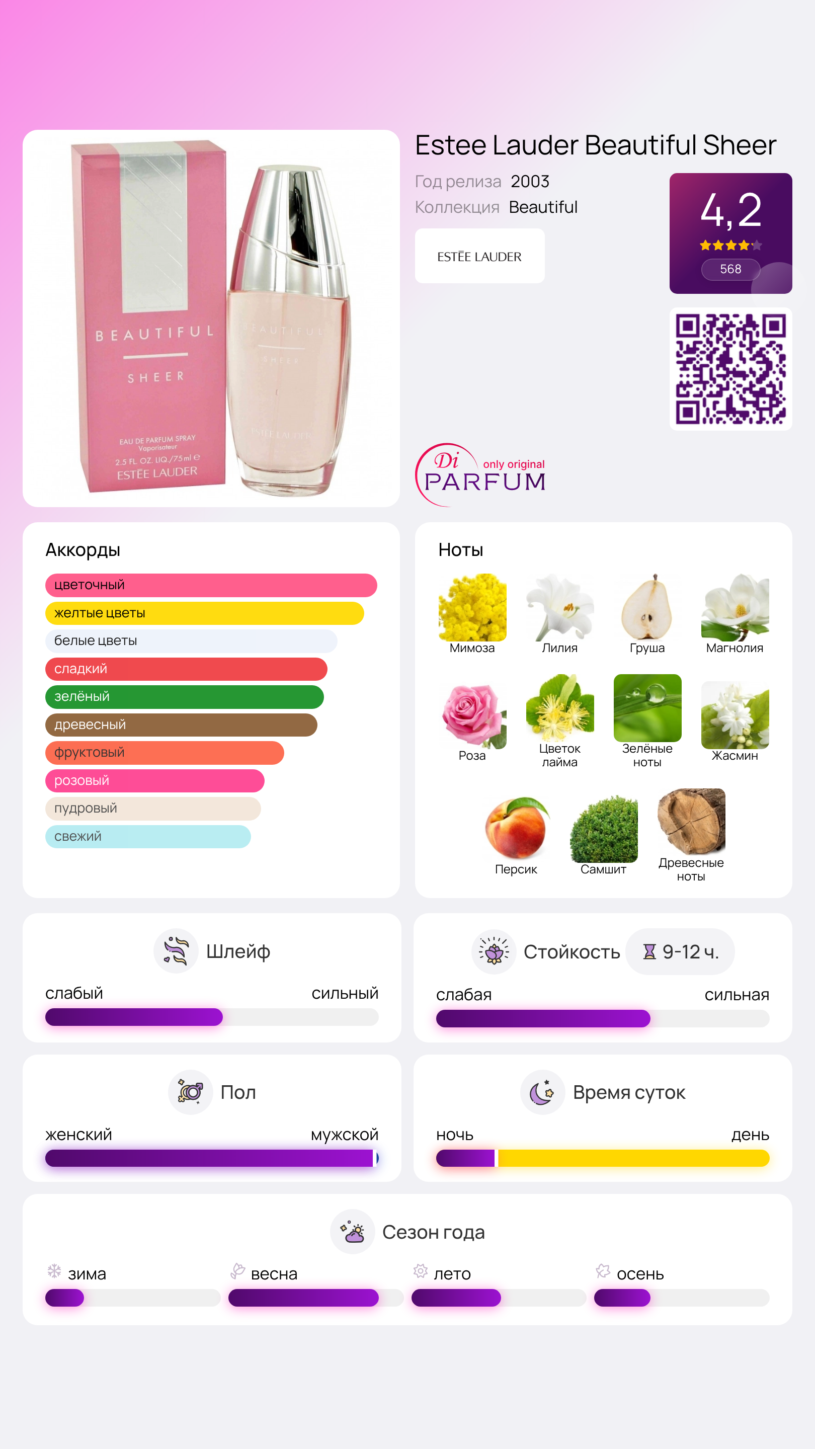 Новый аромат Beautiful Sheer от Estee Lauder Parfum воплощает в себе лучшие традиции романтической женственности. В "сердце" этого парфюма смешались ноты розы, жасмина и древесных акцентов.