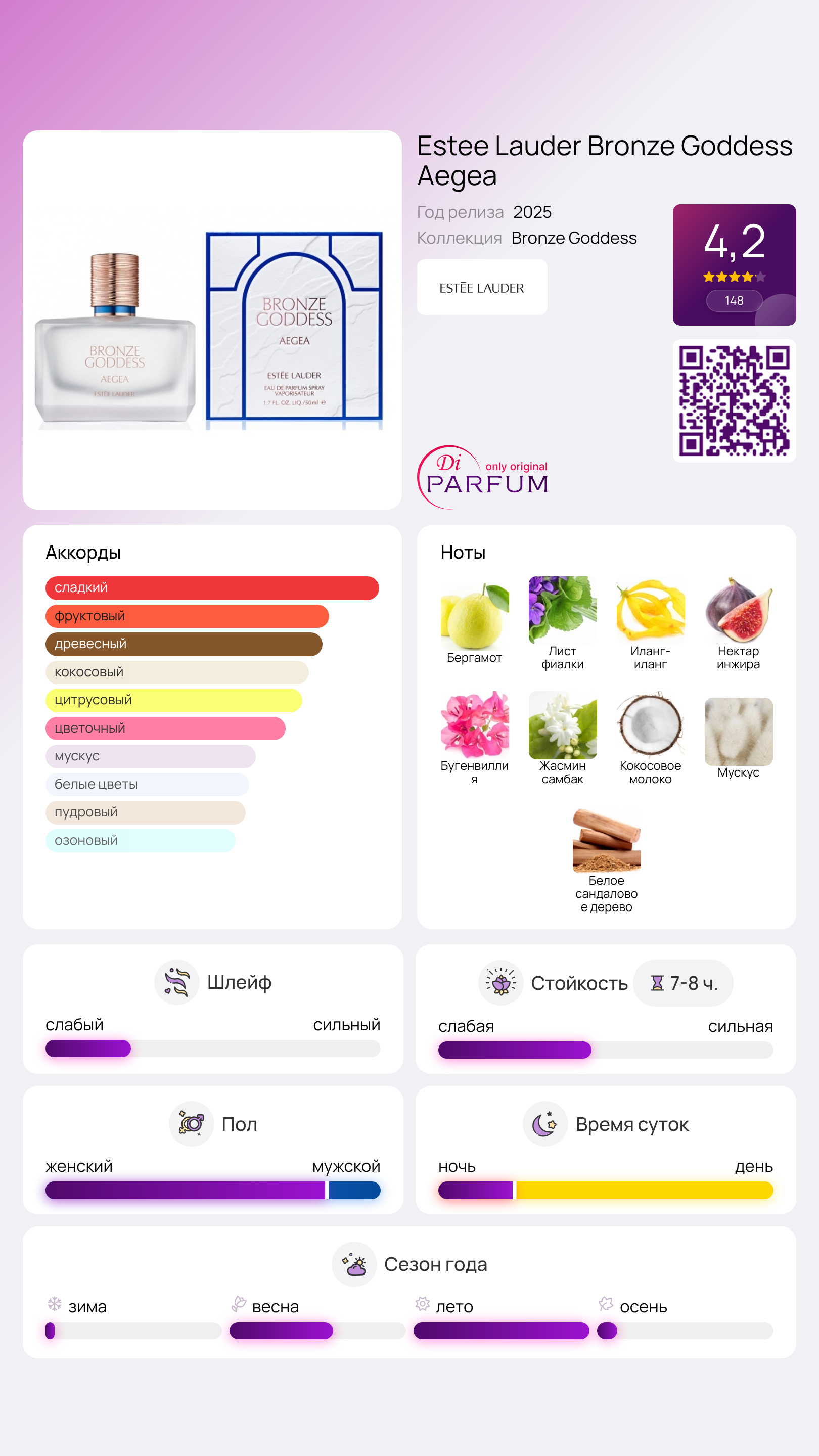 Bronze Goddess Aegea станет идеальным дополнением для летних дней, когда хочется ощутить легкость и свежесть в каждом вдохе. Этот парфюм удивит своей гармонией и станет прекрасным выбором как для повседневной носки, так и для особых случаев. Позвольте себе окунуться в мир изысканных ароматов и живительных фруктов вместе с Bronze Goddess Aegea.