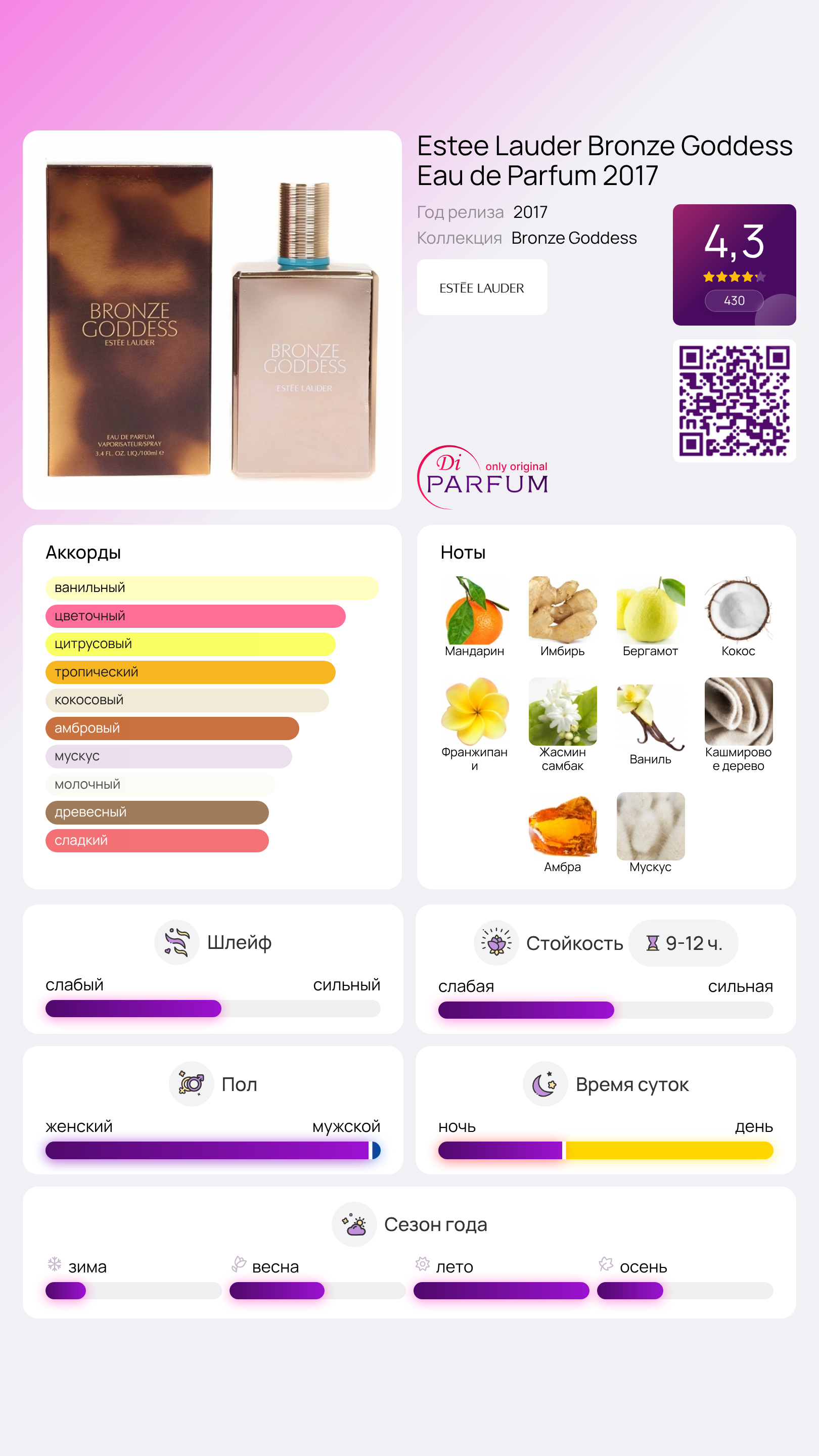 Этот восточный цветочный парфюм для женщин открывается нотами мандарина, бергамота и имбиря; однако это лишь начало всей аромакомпозиции. Сердце парфюма заполнено роскошным кокосом, франжипани и жасмином самбак. Основные ноты уходят в глубокую базу с яркой ванилью, в то время как более нежно проявляются аккорды кашмирского дерева, мускуса и амбры.