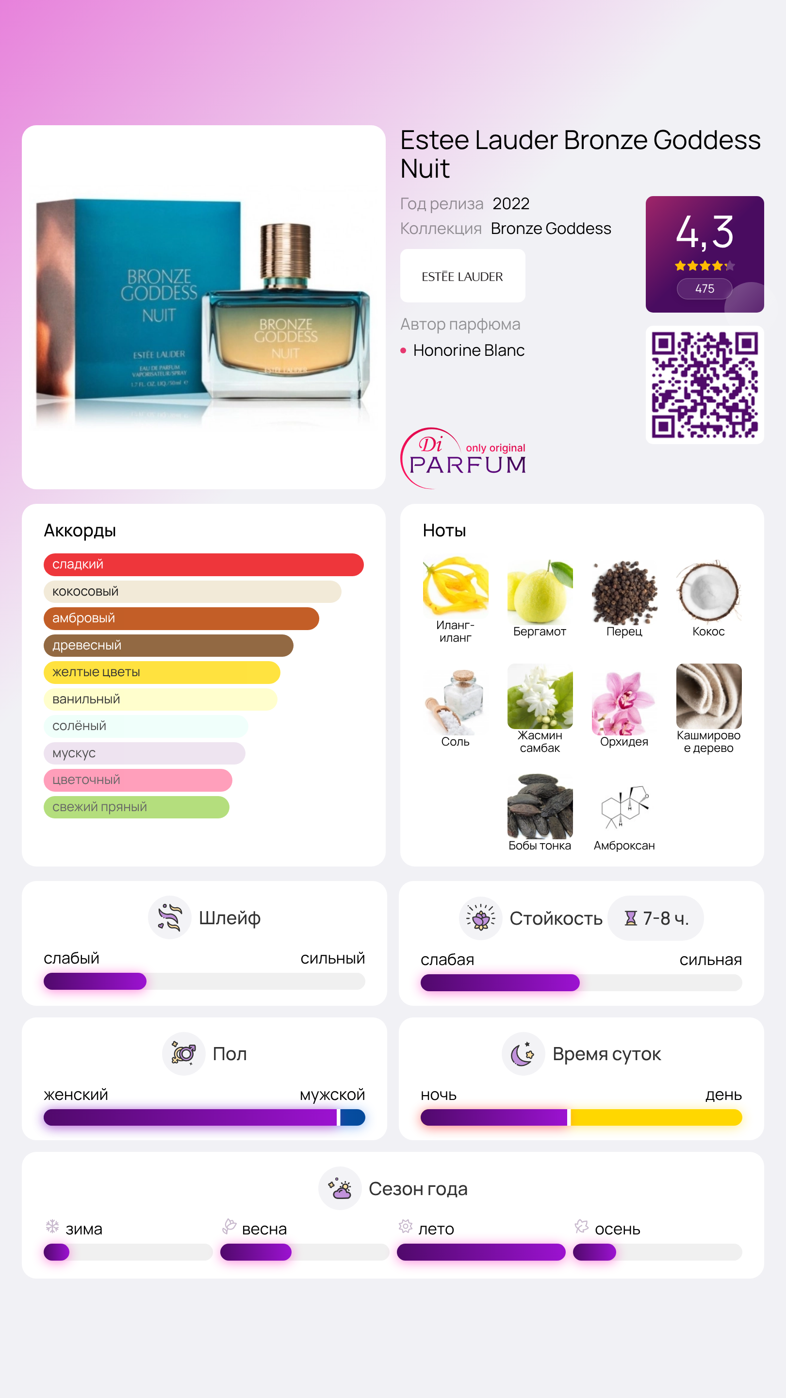 Ночной цветочный букет раскрывается в полной мере, его мистическая красота оставляет впечатление. Кашемировое дерево, ставшее фирменным акцентом, добавляет глубины. Неповторимый шлейф создается с помощью молекулы ambroxan и солодких бобов тонка, придавая аромату особую привлекательность. Bronze Goddess Nuit от Estee Lauder, выпущенный в 2022 году, вобрал в себя и усилил все лучшие черты своего предшественника.