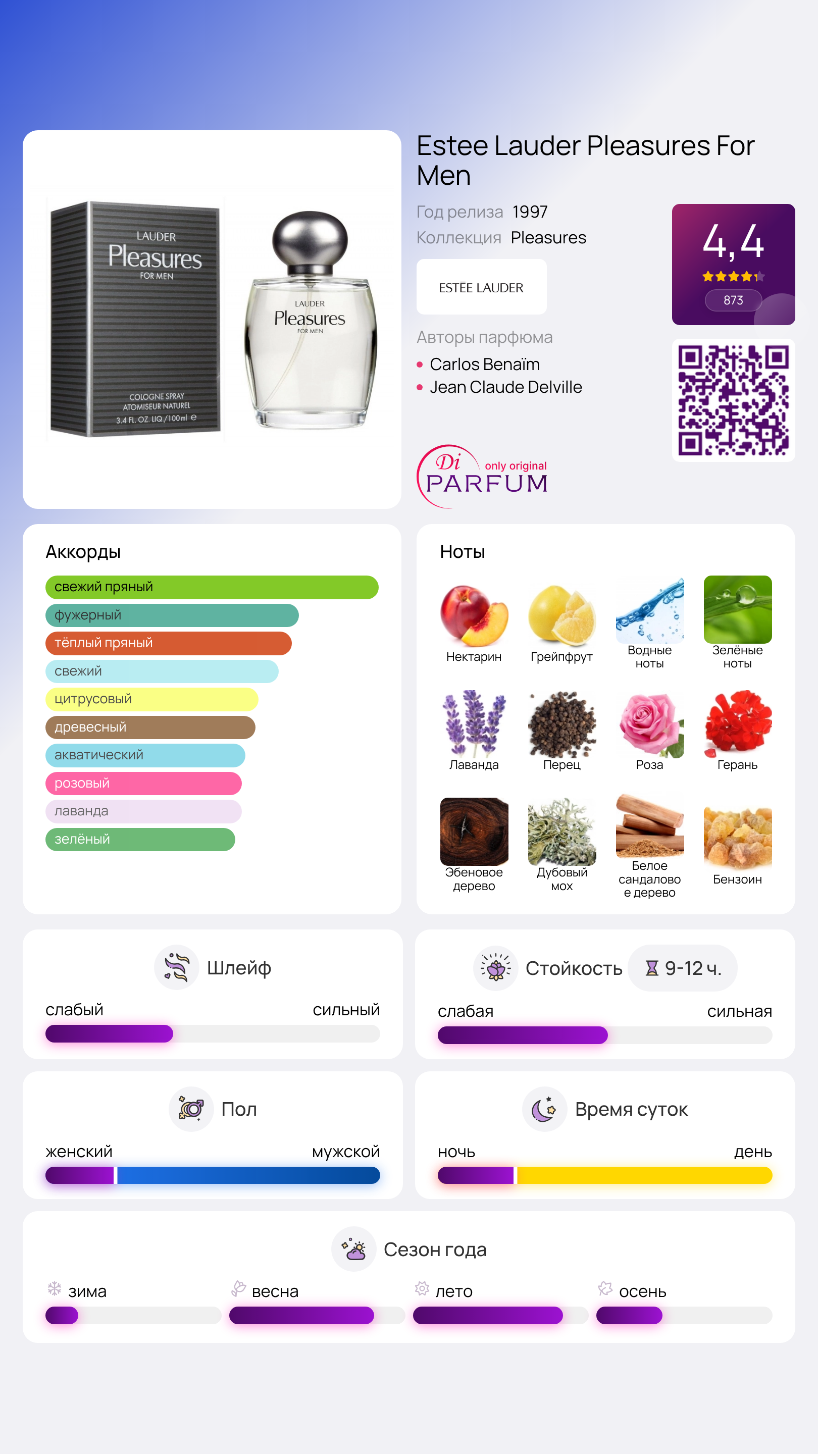 Pleasures For Men от Estee Lauder Parfum олицетворяет мужскую стойкость перед лицом трудностей и умение ценить каждый новый день. Это классический аромат идеально подходит даже для самых серьезных и ответственных мужчин, которые не могут позволить себе легкомысленные взгляды на жизнь.