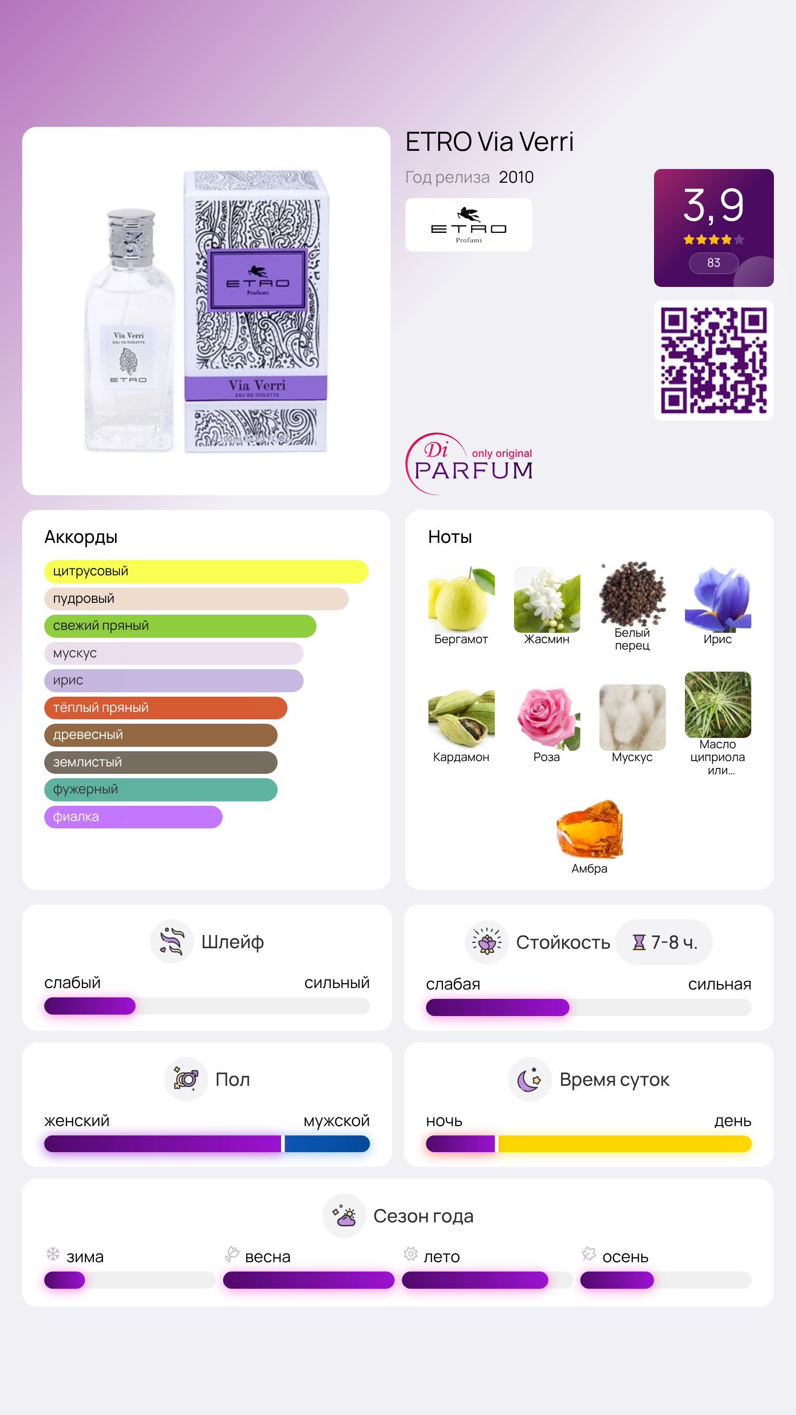 Этот аромат обладает стойкостью и постепенно раскрывает свои тайные грани благодаря насыщенной базе из амбры, мускуса и кипариса. Via Verri подходит как для мужчин, так и для женщин. Его носитель — человек, который знает, как контролировать свои чувства и ценит спокойствие.