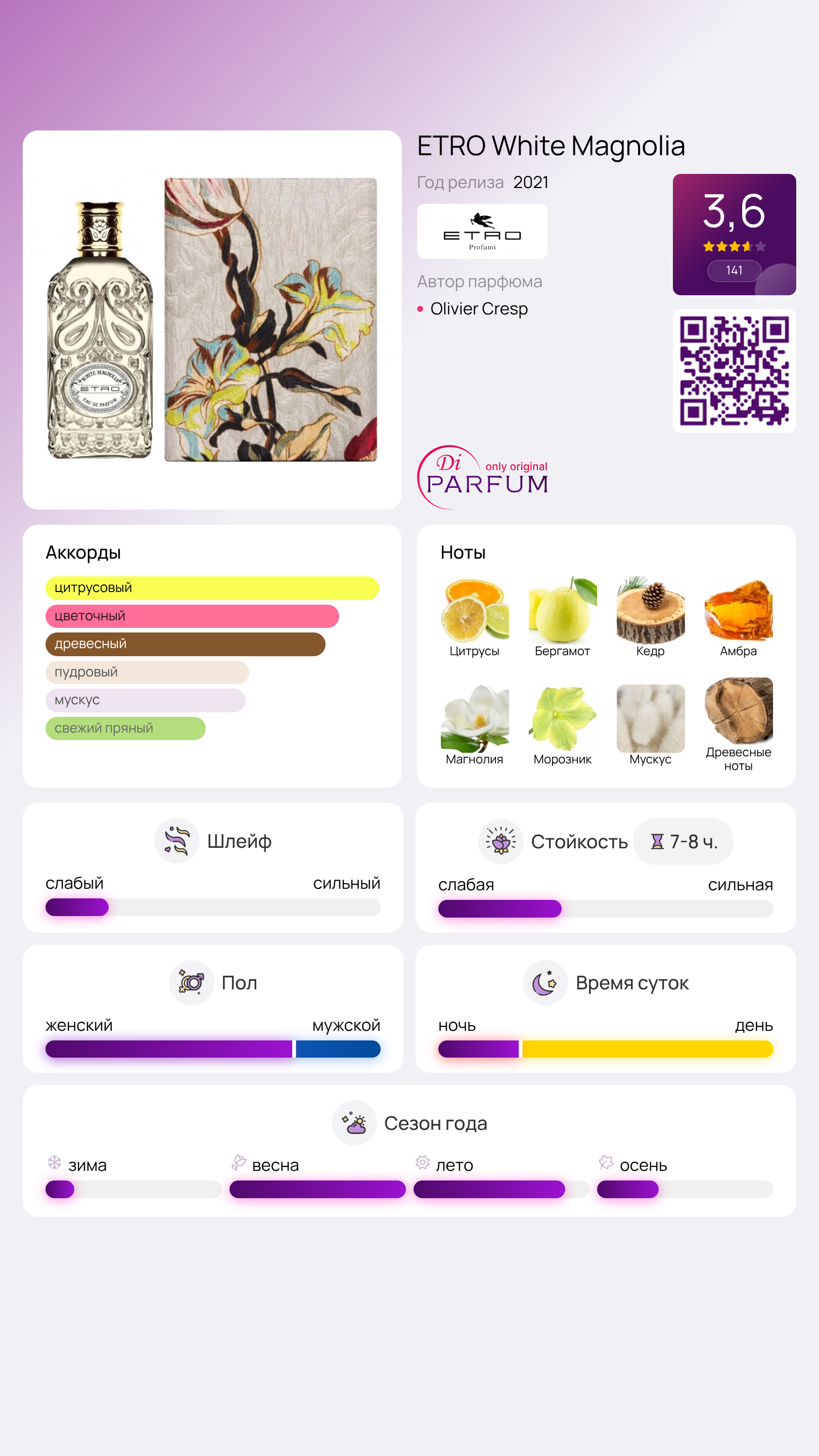 Имя данного бренда широко известно среди любителей уникальных и антикварных изделий, так как увлечение Джироламо Этро тканями и старинными предметами стало основой для создания элегантного модного дома, который стал настоящей иконой в этой области. Парадоксально, но парфюм ETRO White Magnolia логично вписывается в данную традицию.
