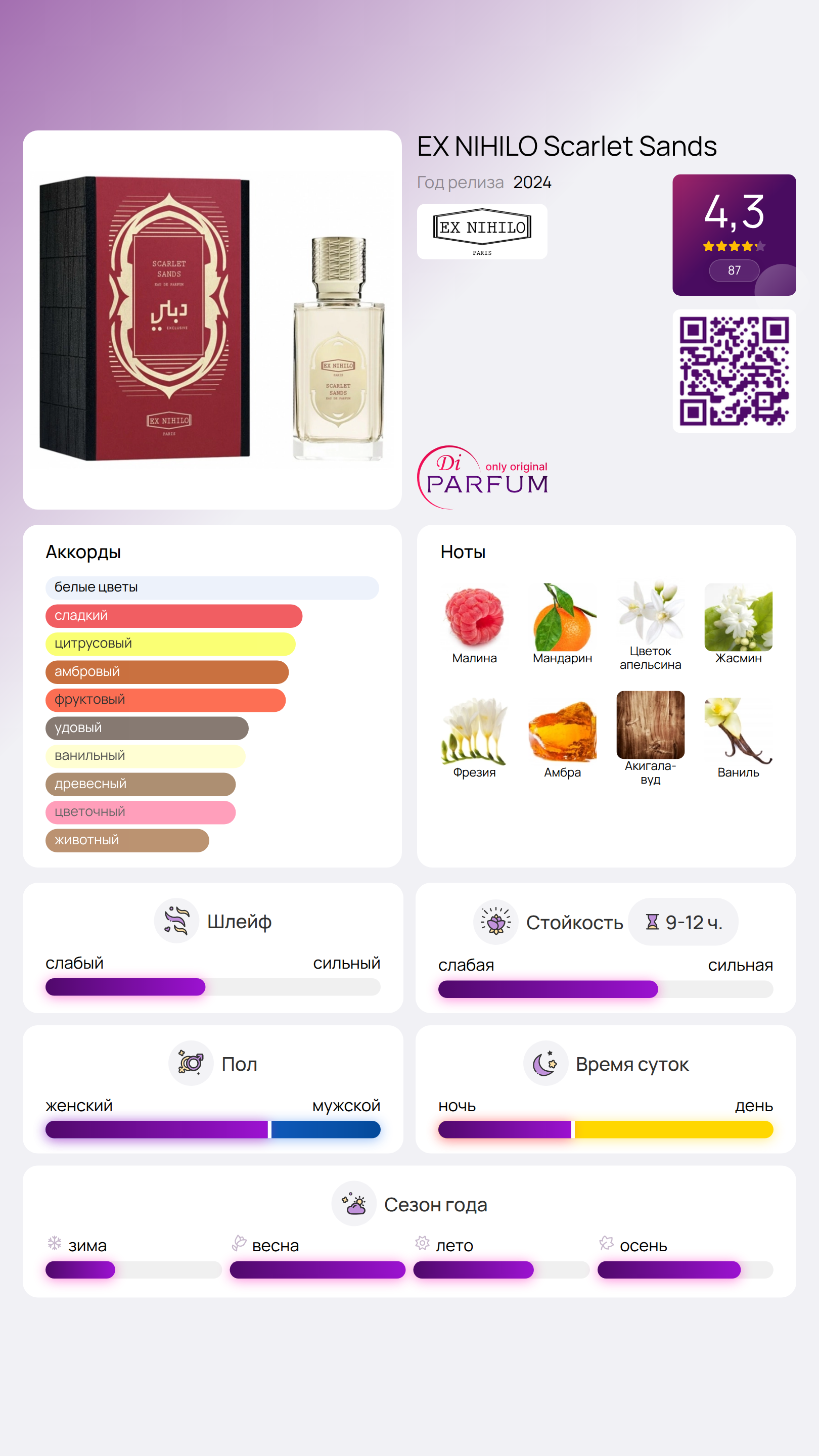 Scarlet Sands от Ex Nihilo – это восточно-цветочный аромат для женщин и мужчин, который обладает уникальной композицией и создан для ценителей изысканных парфюмерных находок. Этот новый аромат был представлен в 2024 году и разработан талантливым парфюмером Jordi Fernández.