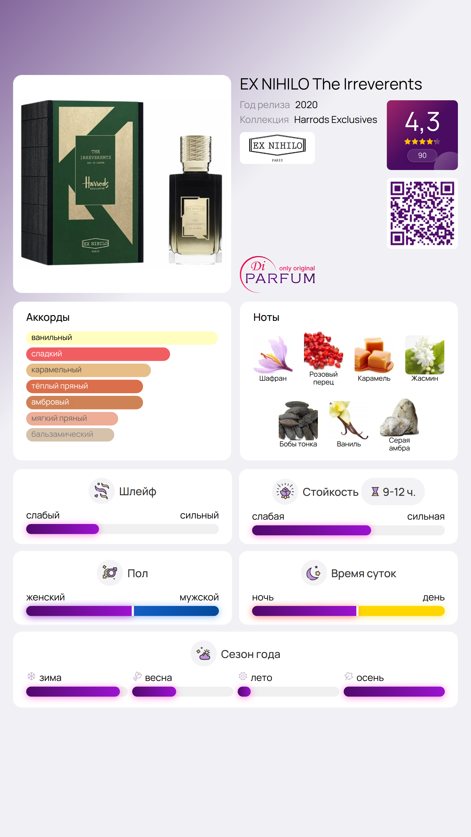 Этот аромат олицетворяет смелость и разнообразие современной лондонской жизни, представляя собой дань уважения новому поколению жителей города, которые черпают вдохновение из классических традиций, но создают свой уникальный путь. The Irreverents выражает контраст старого и нового, слияние привычных ароматов ванили и жасмина с яркими нотами специи.