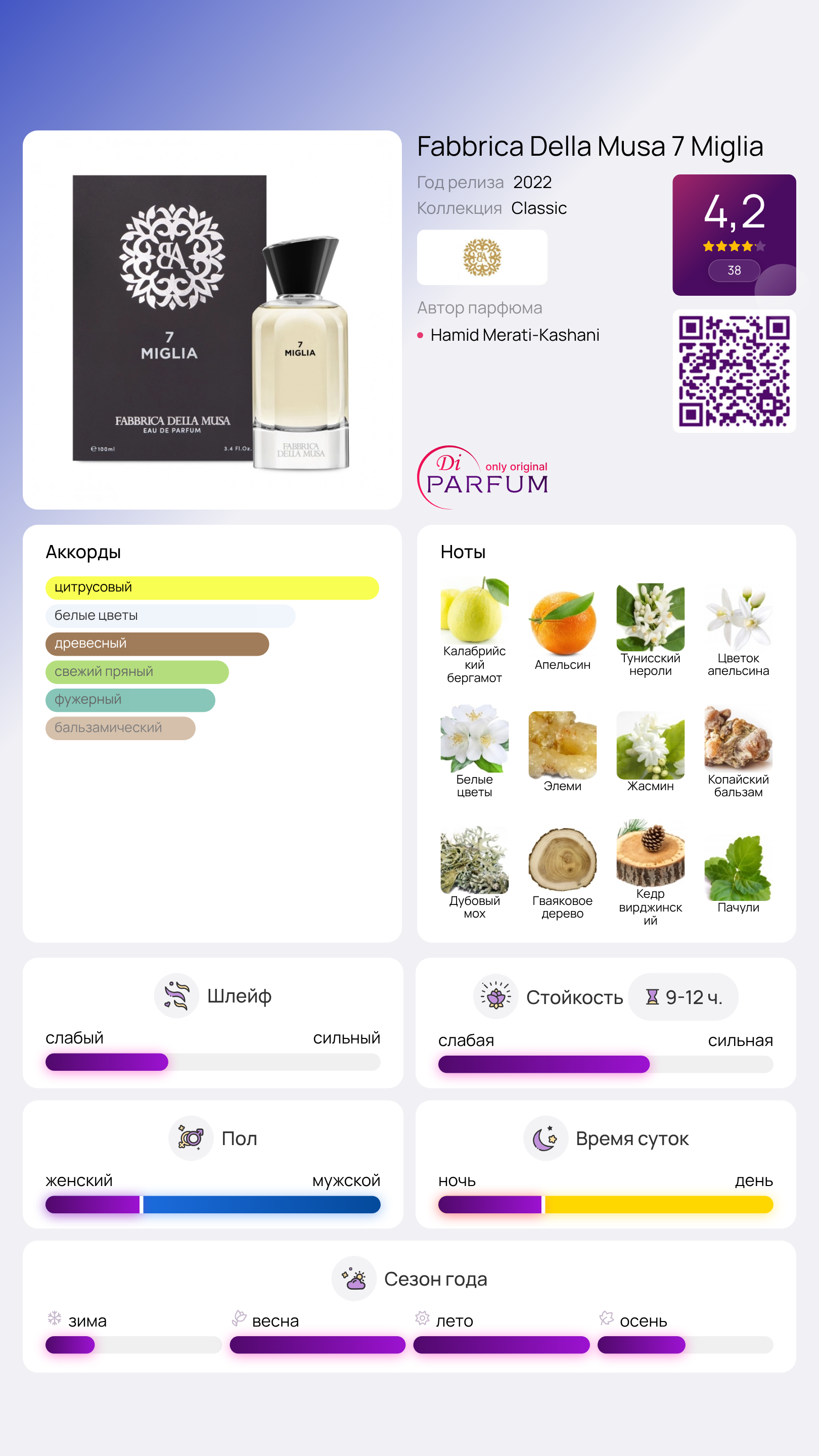 Все это великолепие гармонично дополняется экзотическими нотами, напоминающими лимонную цедру и отполированное ветром древесину элеми. Завершающая часть композиции, разработанная Hamid Merati-Kashani, украшена резьбой по благородным породам деревьев — терпкими бальзамическими нотами гваяка и смолистыми оттенками величественного кедра. Их корни прячутся в изумрудном влажном мхе, а пряный восточный характер тонка и сухой, горьковатый привкус пачули формируют незабываемый шлейф Fabbrica Della Musa 7 Miglia.