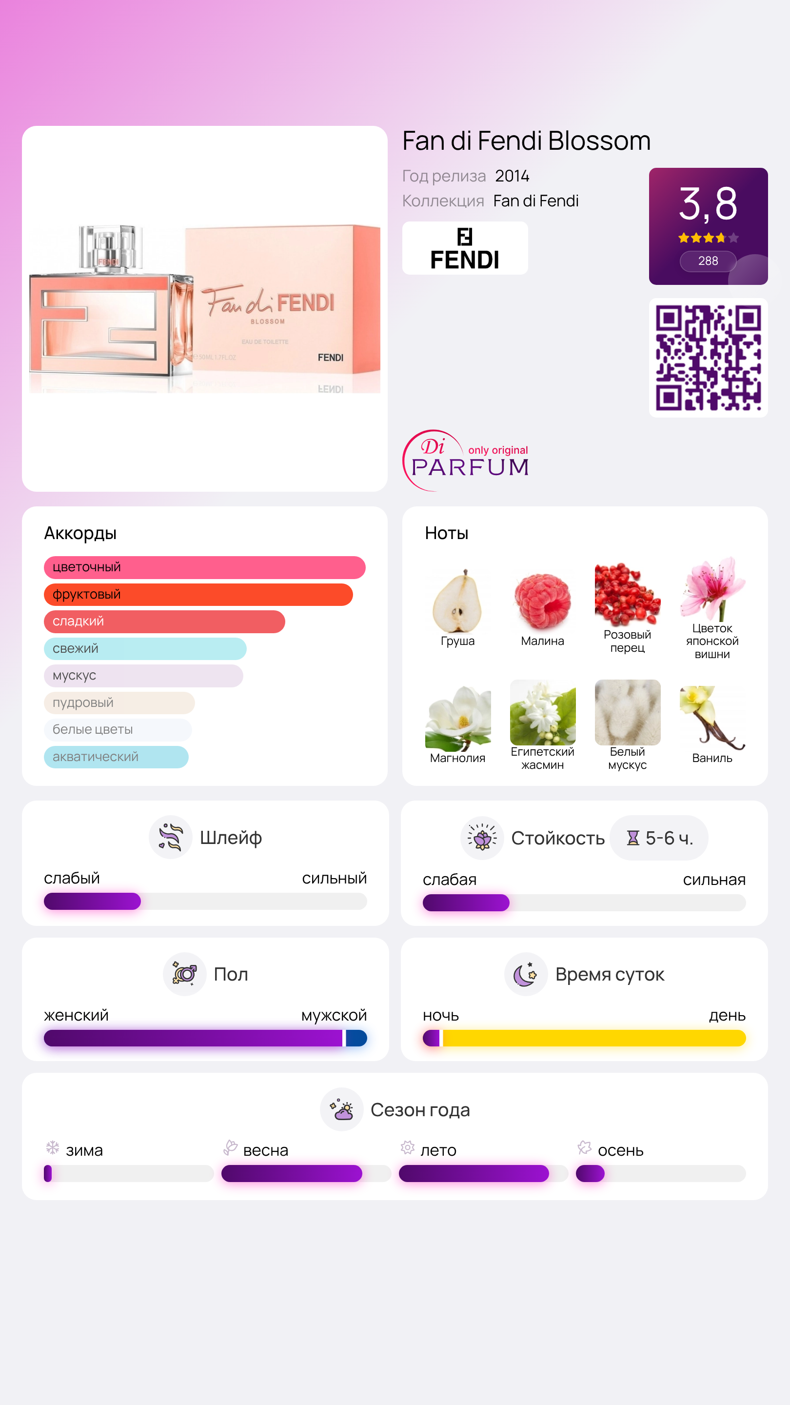 С наступлением весны, аромат Fan di Fendi Blossom вобрал в себя свежесть и аромат blossoming сезона, включая романтические оттенки привлекательной вишни, жасмина и китайской магнолии.