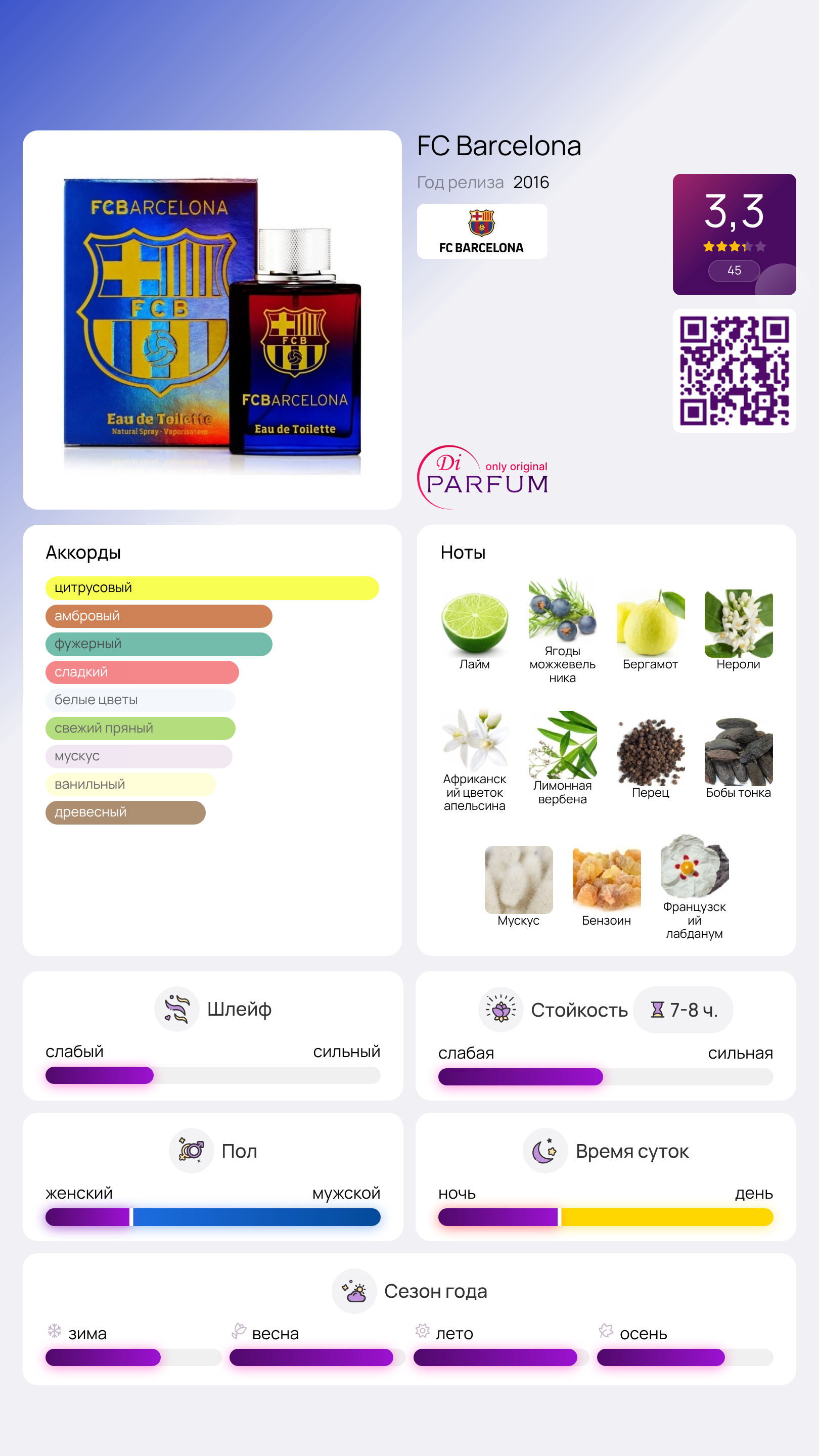 FC Barcelona — это настоящее сокровище для поклонников известного испанского футбольного клуба и для тех, кто обожает яркие, освежающие ароматы. Цитрусовая композиция идеально воплощает атмосферу и дух спортивного клуба, передавая силу и энергию тех, кто стремится к успеху.