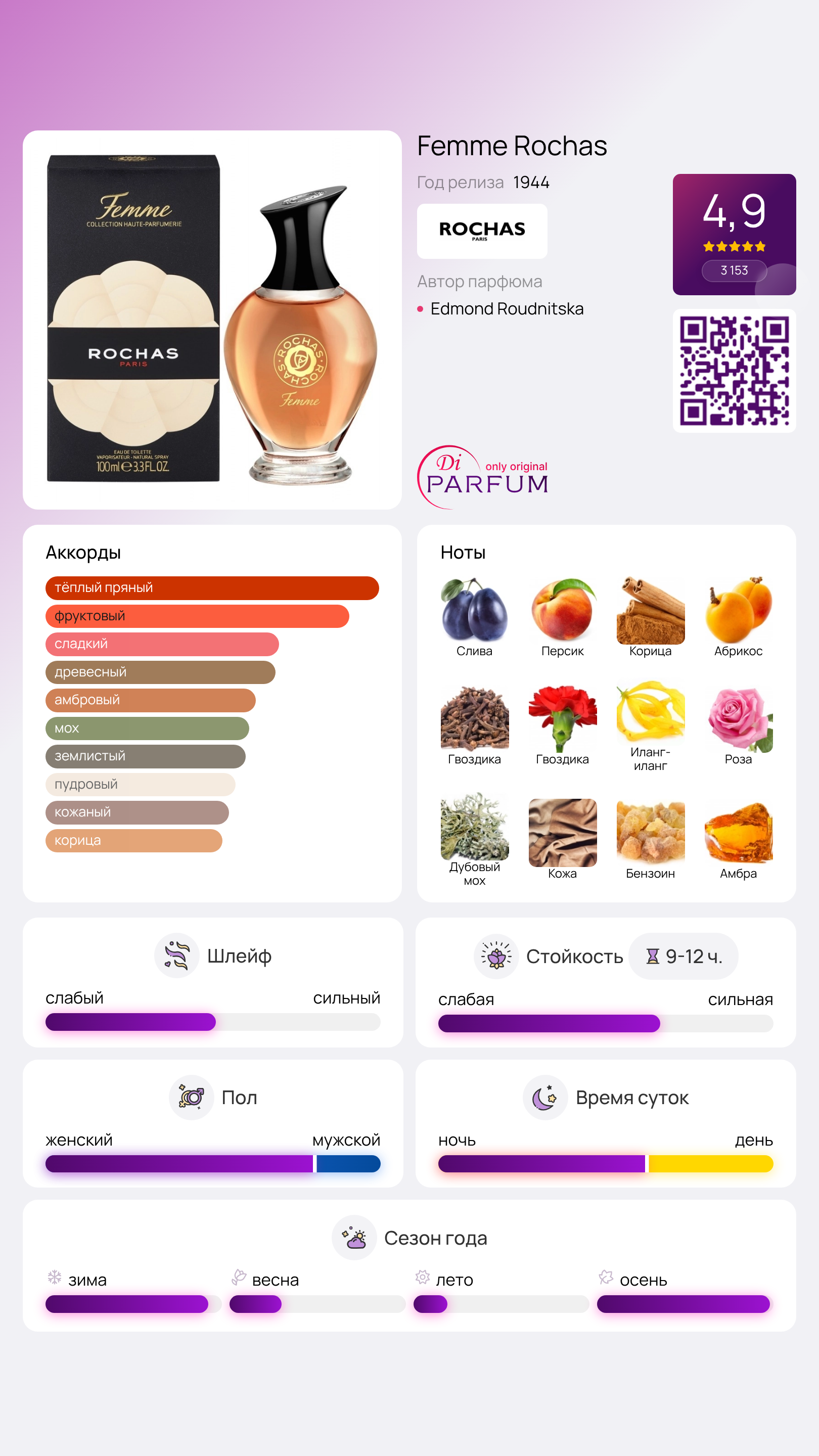 В 1943 году в Париже был представлен знаменитый аромат Femme от дома Rochas. Эта парфюмерная композиция считается настоящим произведением искусства, в ней идеально соединяются теплота мягкой женской кожи и плотный, слегка терпкий аромат сливы.
