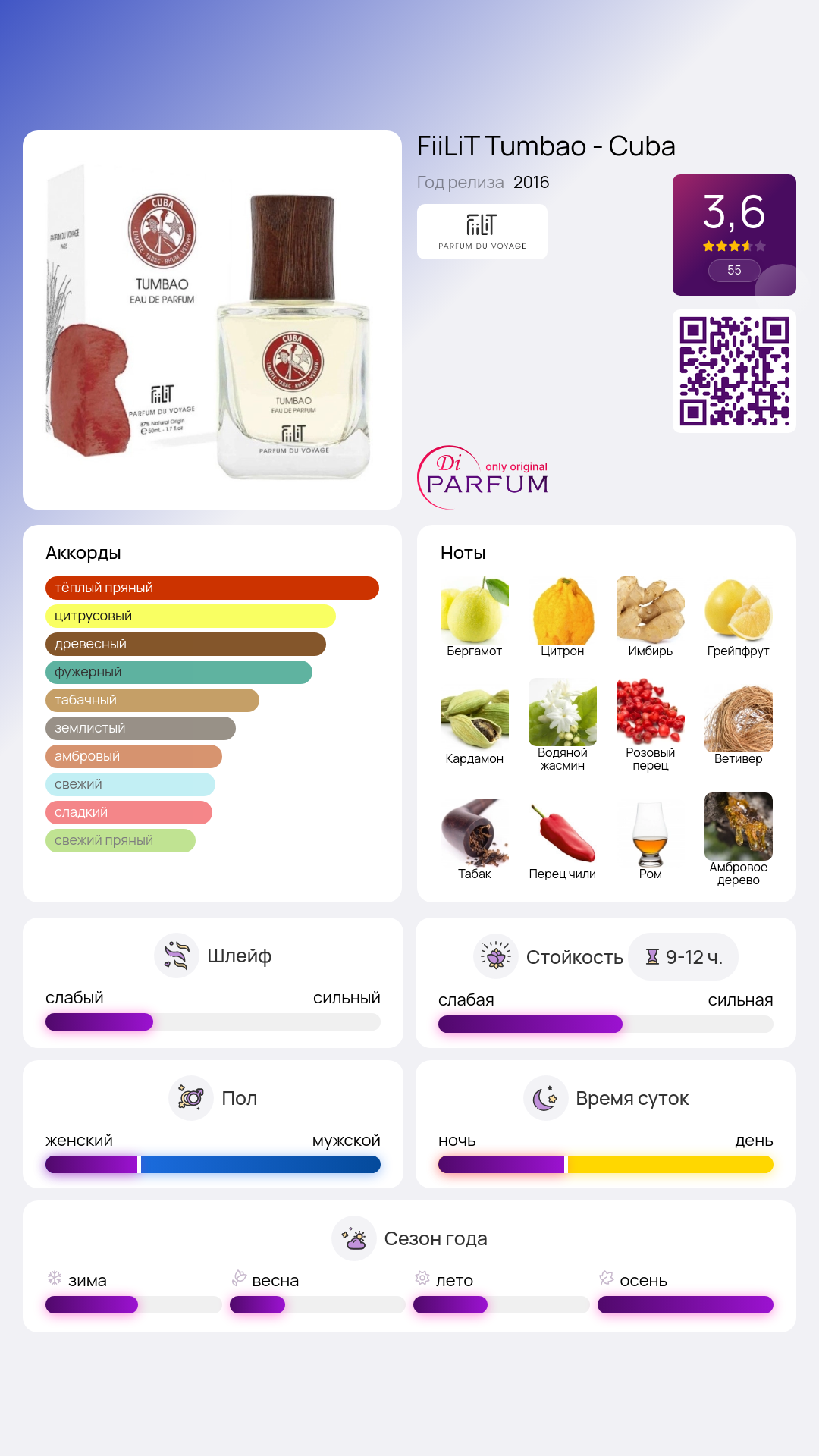 Пряные ноты водяного жасмина смешиваются с ромом, увлажненным ветивером и срезанными табачными листьями, а также древесной молекулой ambewood. Композиция Tumbao – Cuba от FiiLiT является классической и мощной, символизируя трепетное восприятие экзотических странствий. Этот парфюм был представлен французским брендом в 2016 году.