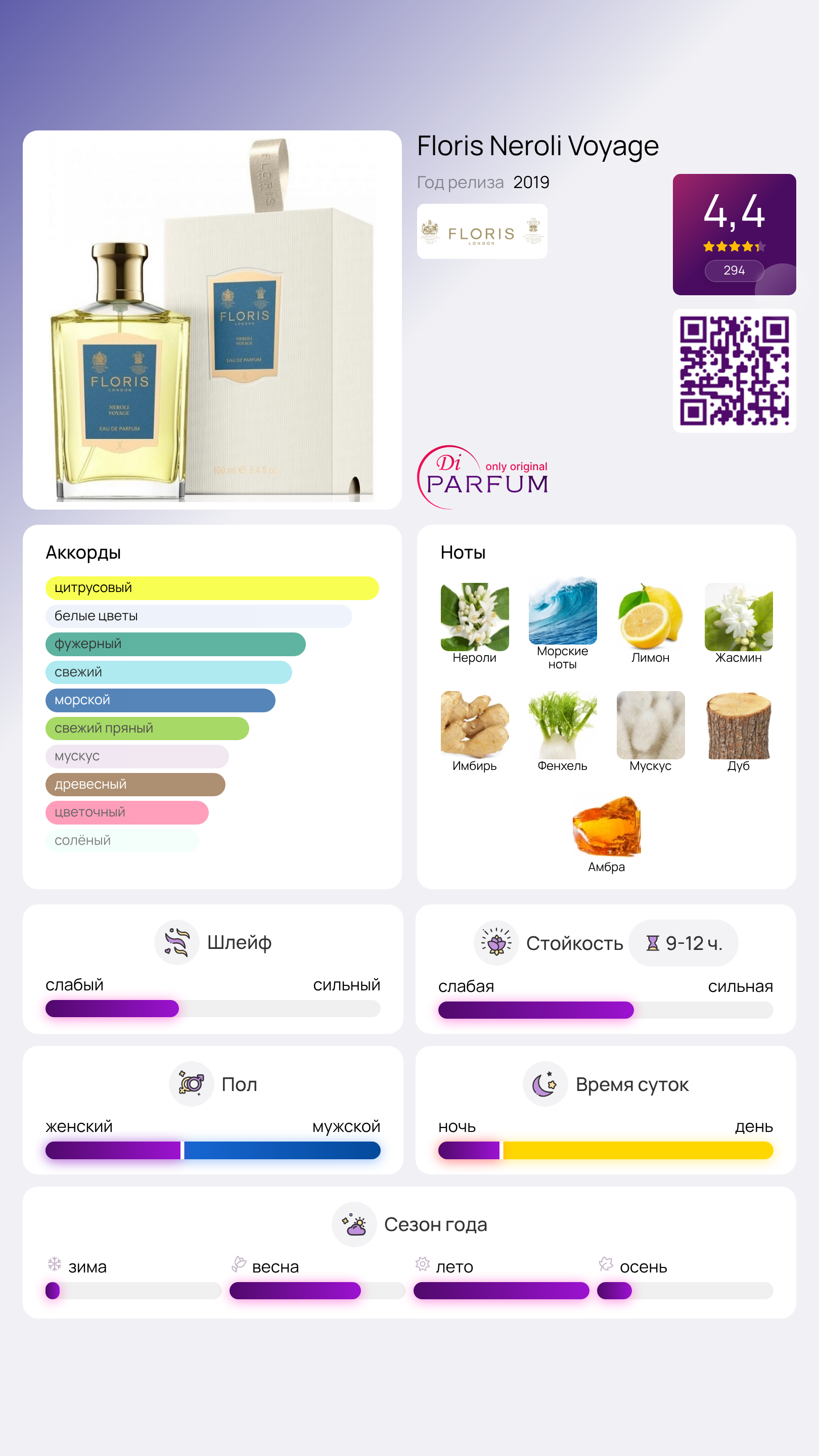 Плотный и мощный шлейф формируется из древесины корсиканского дуба, акцентированного ароматным фенхелем, заключенным в соблазнительное мускусное облако. Благодаря своей яркой композиции, Neroli Voyage от Floris стал идеальным выбором для теплых сезонов.