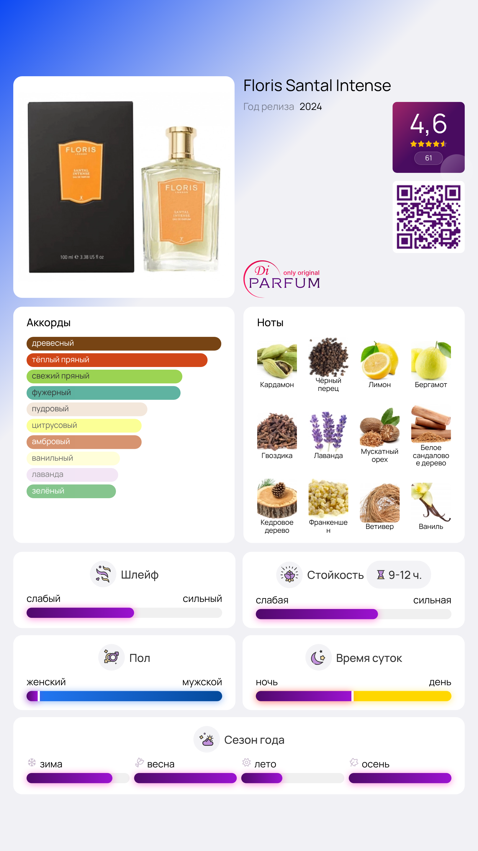 Santal Intense от Floris — это ароматный фужерный парфюм для мужчин, который был выпущен в 2024 году. Этот новый аромат быстро завоевал популярность благодаря своему уникальному составу. Верхние ноты включают кардамон, черный перец, лимон, бергамот и зеленую траву. В сердце композиции находятся гвоздика, лаванда и мускатный орех, а базу составляют сандал, кедр, ладан, ветивер, ваниль, амбра и мускус.