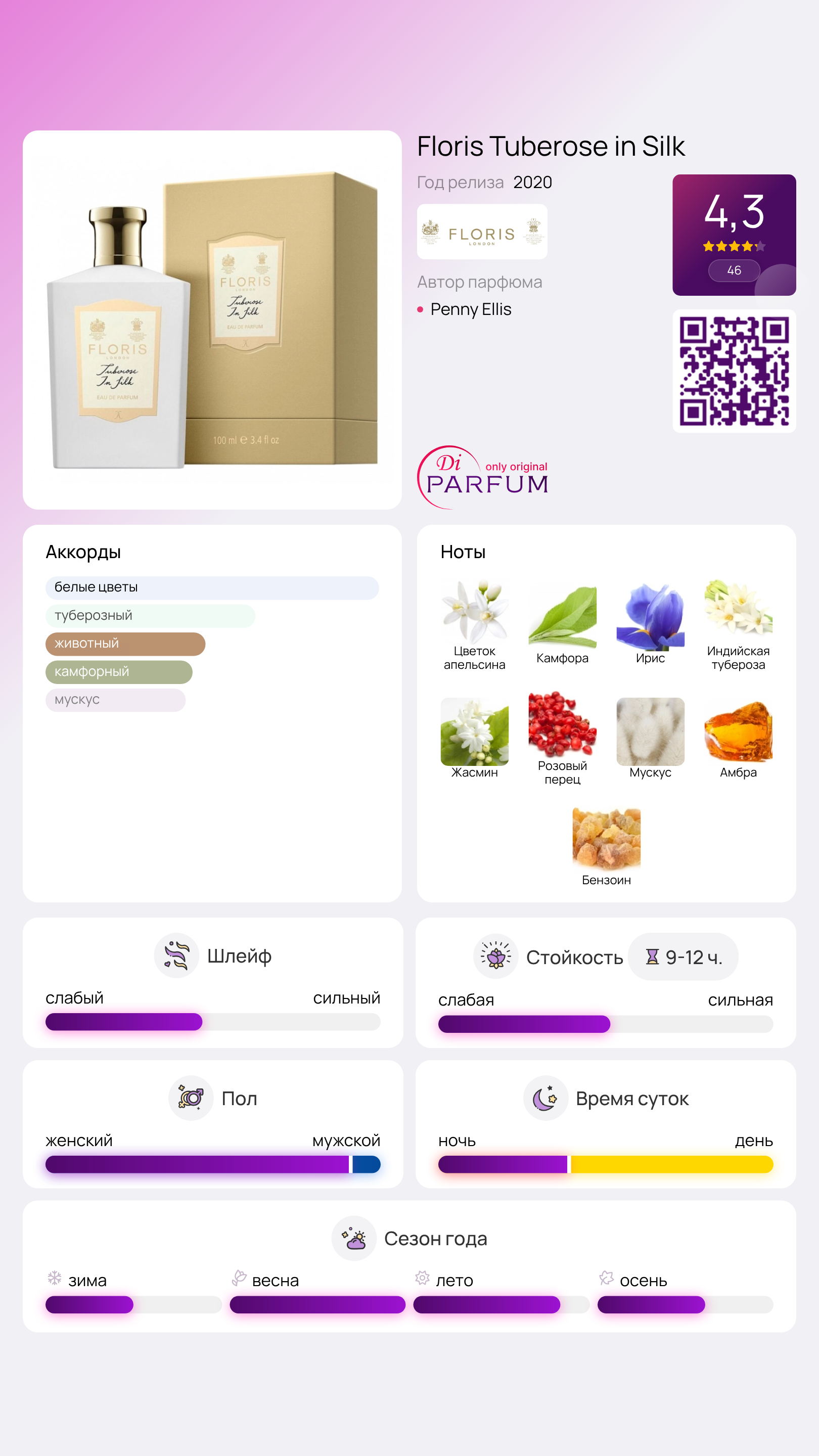 Пышные соцветия «главной героини» окружены насыщенным жасмином и сладким цветом апельсина. Ванильный бензоин привносит фруктовый оттенок, смешиваясь с соблазнительным мускусом. Ирисовая пудра излучает мягкость, а пикантный розовый перец создает атмосферу легкого флирта, в то время как волнующая амбра привносит нотки восточного очарования.