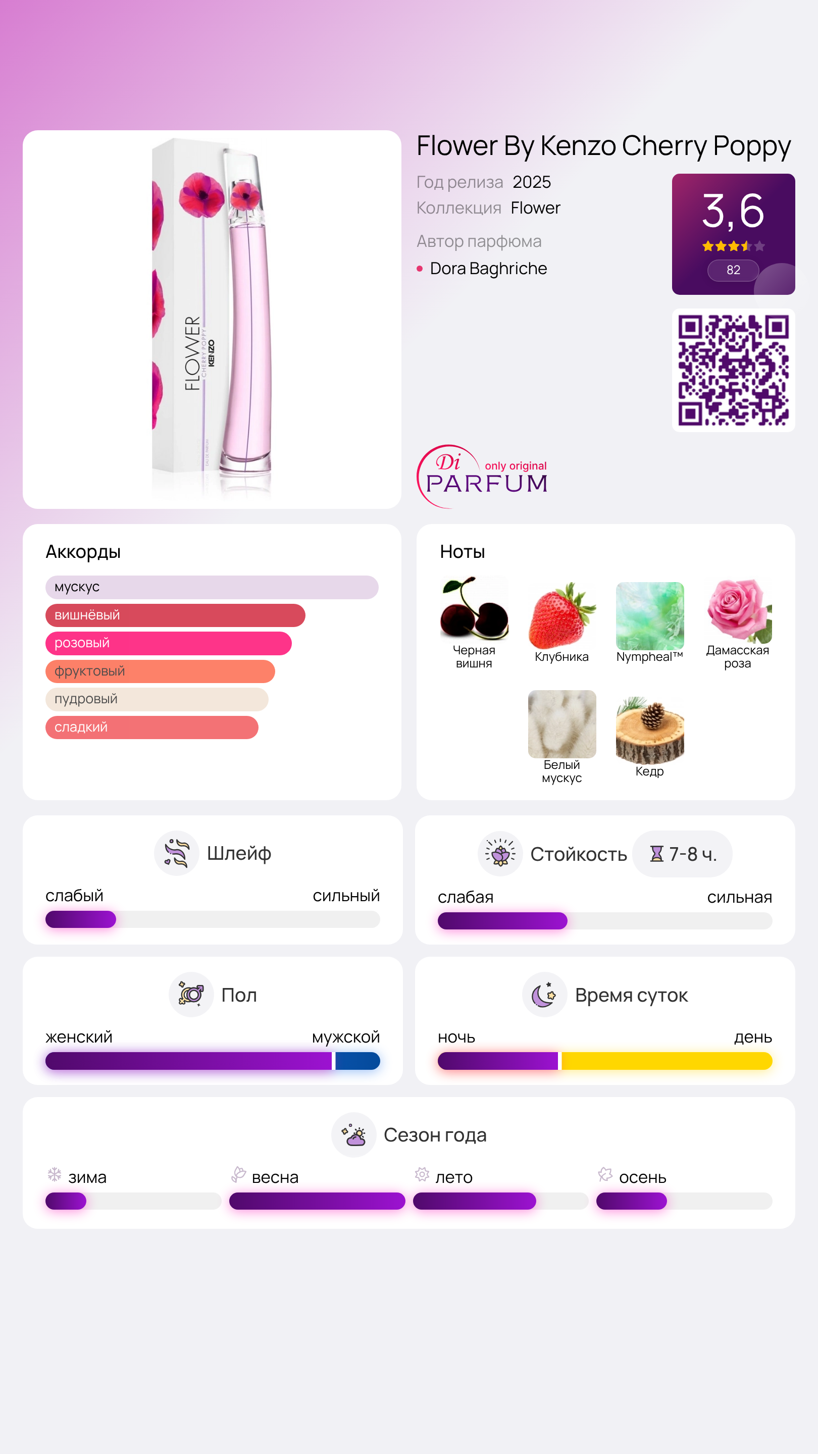 Flower By Kenzo Cherry Poppy вдохновлён искусством японских сладостей, что придаёт ему уникальный и мягкий характер. Этот парфюм идеально подходит для весенне-летнего сезона, когда хочется окружить себя чем-то легким и вдохновляющим. Он отлично подойдёт как для повседневного использования, так и для особых случаев, когда вы хотите подчеркнуть свою индивидуальность. Погрузитесь в мир Floral Fruity с Flower By Kenzo Cherry Poppy и позвольте себе быть очарованной!