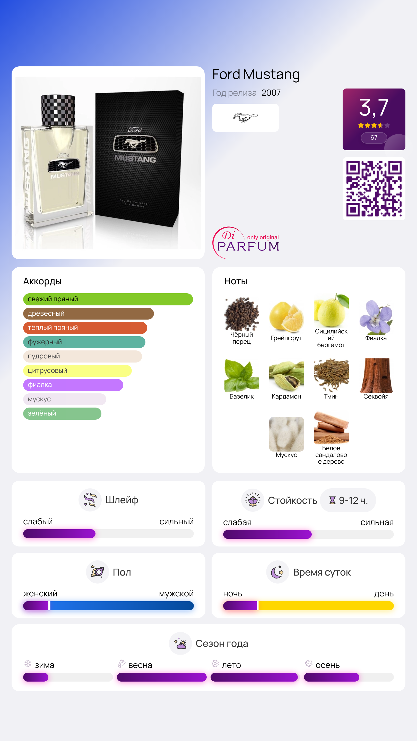 В качестве основы используются древесные ноты дикой секвойи, с бальзамическим оттенком сандалового дерева и сладострастным мускусом, придающим теплоту. Аромат Ford Mustang, насыщенный спортивным духом побед, идеально подчеркнет характер мужчины, который уверен в себе как в жизни, так и в любви.