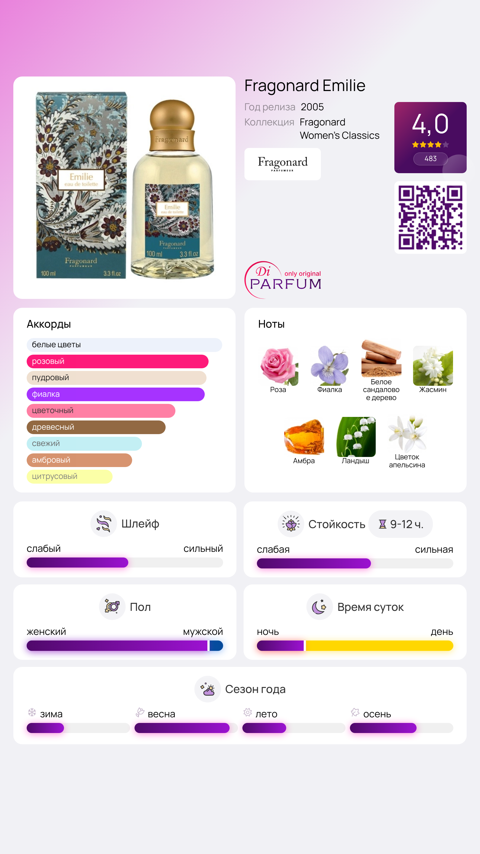 Композиция под названием Emilie идеально соответствует этому описанию. Бренд Fragonard представил этот аромат в довольно скромном оформлении. Его простой флакон и неприметная упаковка обманут ожидания, ведь аромат сам по себе – настоящая мелодия! Слагается она из нот фиалки, розы, сандала, жасмина, апельсинового цвета, амбры и ландыша. Emilie имеет богатую, бархатную текстуру, вызывающую воспоминания о старинной атмосфере и определенно понравится любителям ретро-ароматов.