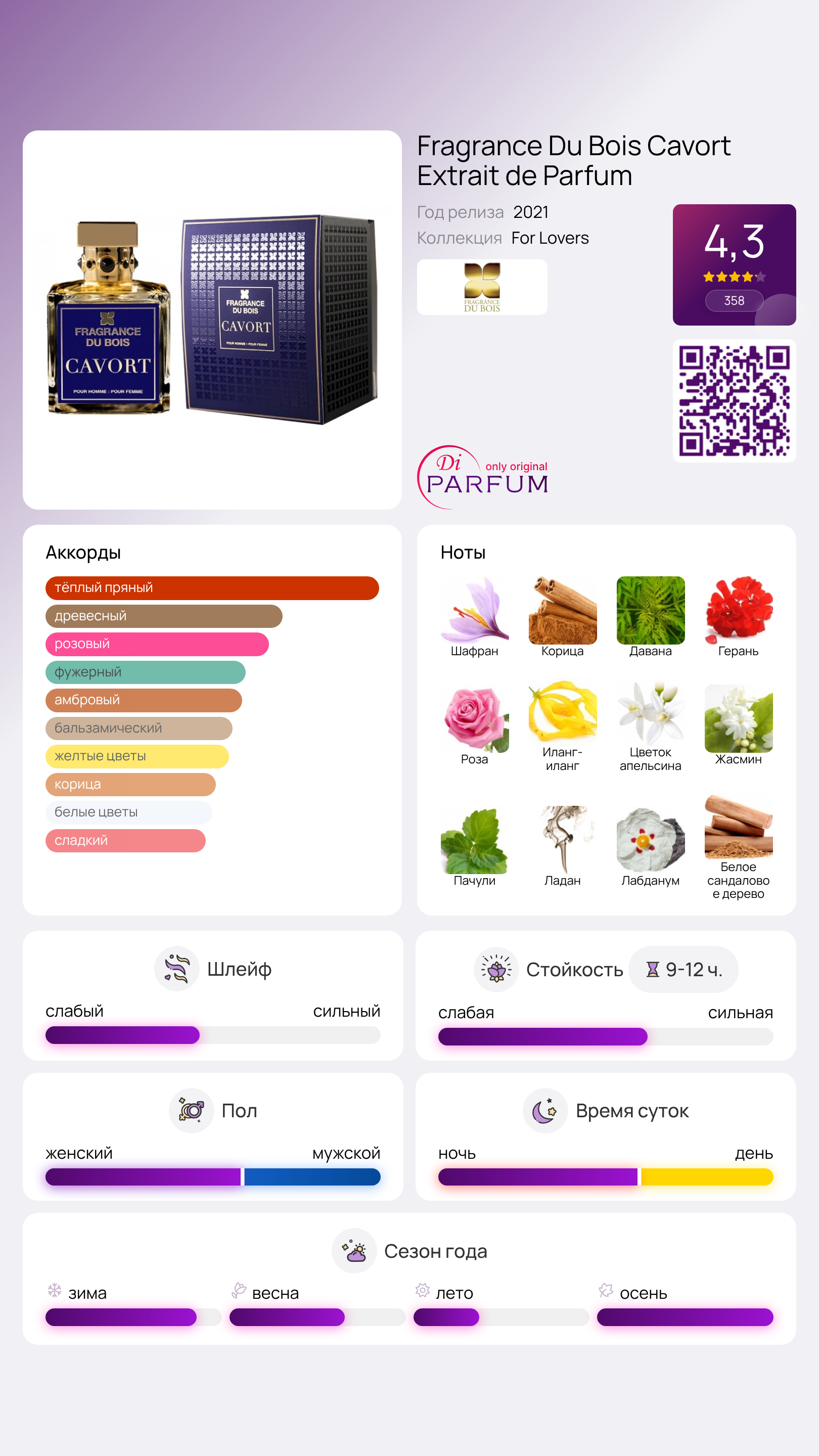 Уникальное сочетание интенсивной герани и нежной корицы подчеркивает чувственность. Экзотические цветы создают ассоциации с нежными прикосновениями к коже. Утонченная давана, как истинный хамелеон, обогащает аромат своими многогранными нотами.
