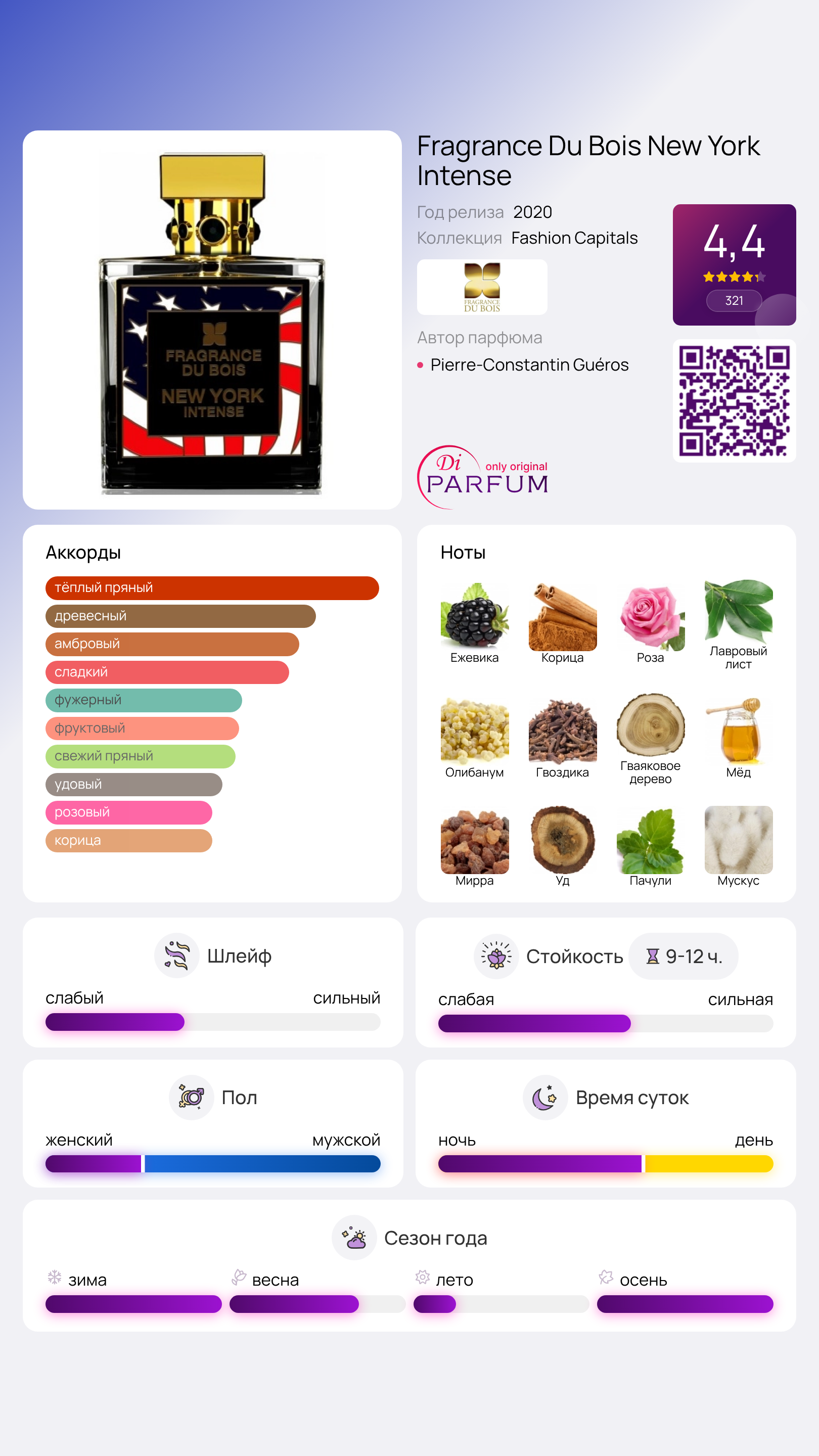 Это аромат навеивает ассоциации с полуденным временем, когда вы, находясь на высоте 50 этажей, наблюдаете за людьми и живописными пейзажами Центрального парка. New York Intense от Fragrance Du Bois – это не просто парфюмерная вода класса люкс, это выдающийся триумф французского бренда. Элегантный флакон украшен национальными символами страны.