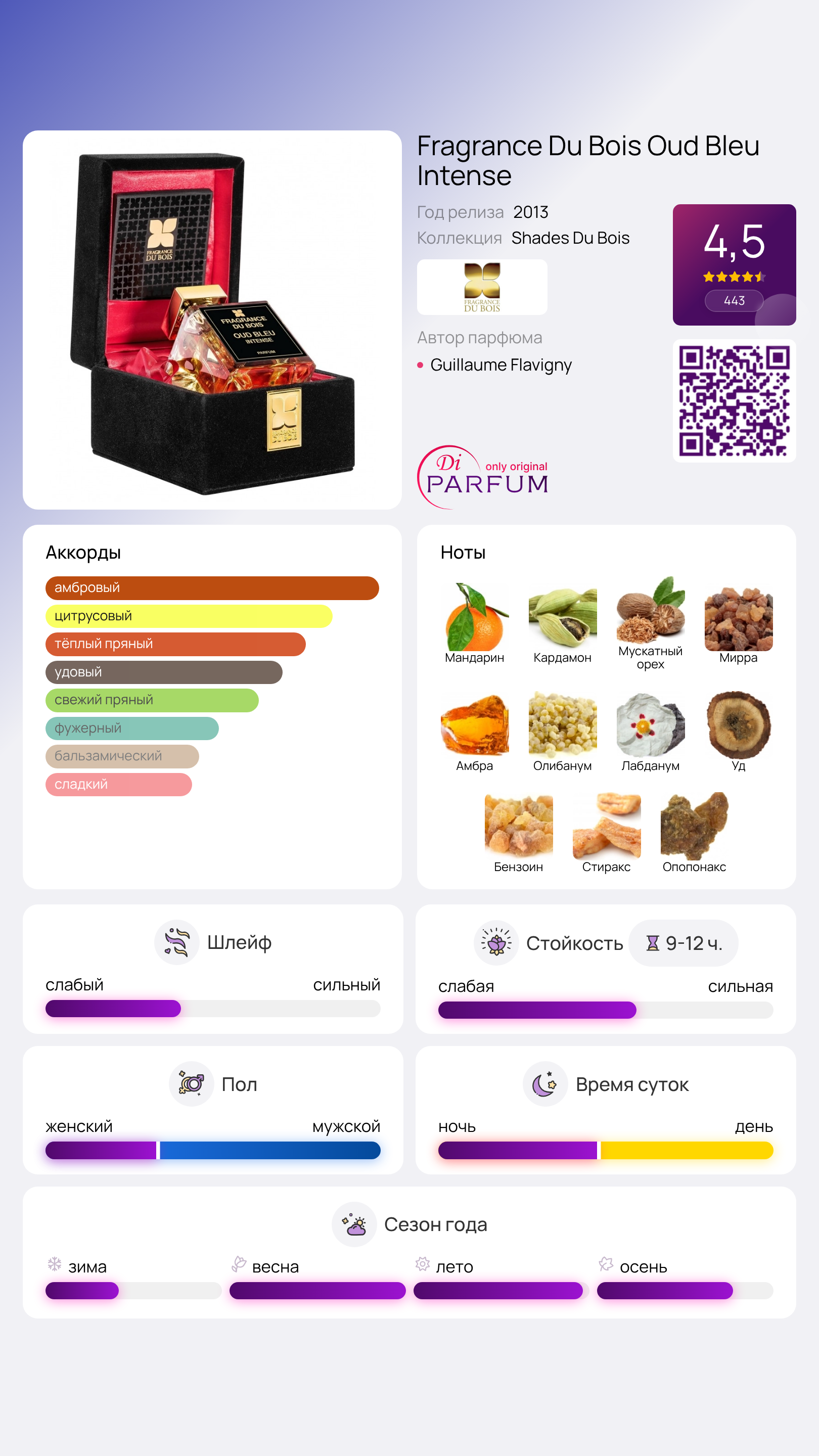 Завершает очаровательную гурманскую мелодию Oud Bleu Intense от Fragrance Du Bois насыщенный и текстурированный шлейф, состоящий из анималистичных нот бензоина, таинственного уда, изменчивого стиракса и чарующей мирры, добавляющего аромату особую магию.