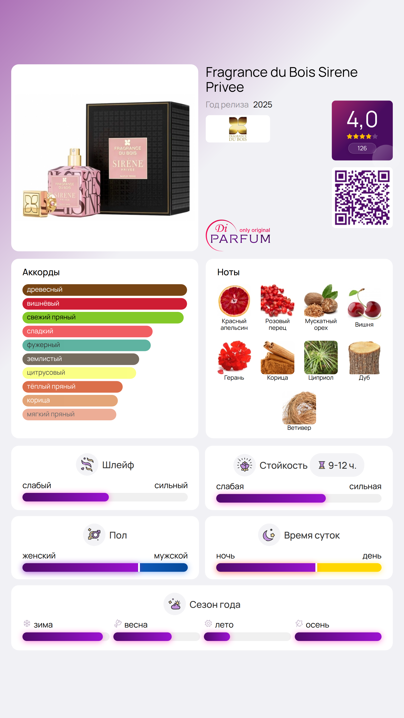 Sirène Privée от Fragrance Du Bois — это древесно-пряный аромат для женщин, который был впервые представлен в 2025 году. За созданием этого уникального парфюма стоит талантливый парфюмер Уэсли Перумал. Аромат открывается яркими нотами красного апельсина, розового перца и мускатного ореха, которые плавно переходят в сердце композиции, наполненное вишней, геранью и корицей.