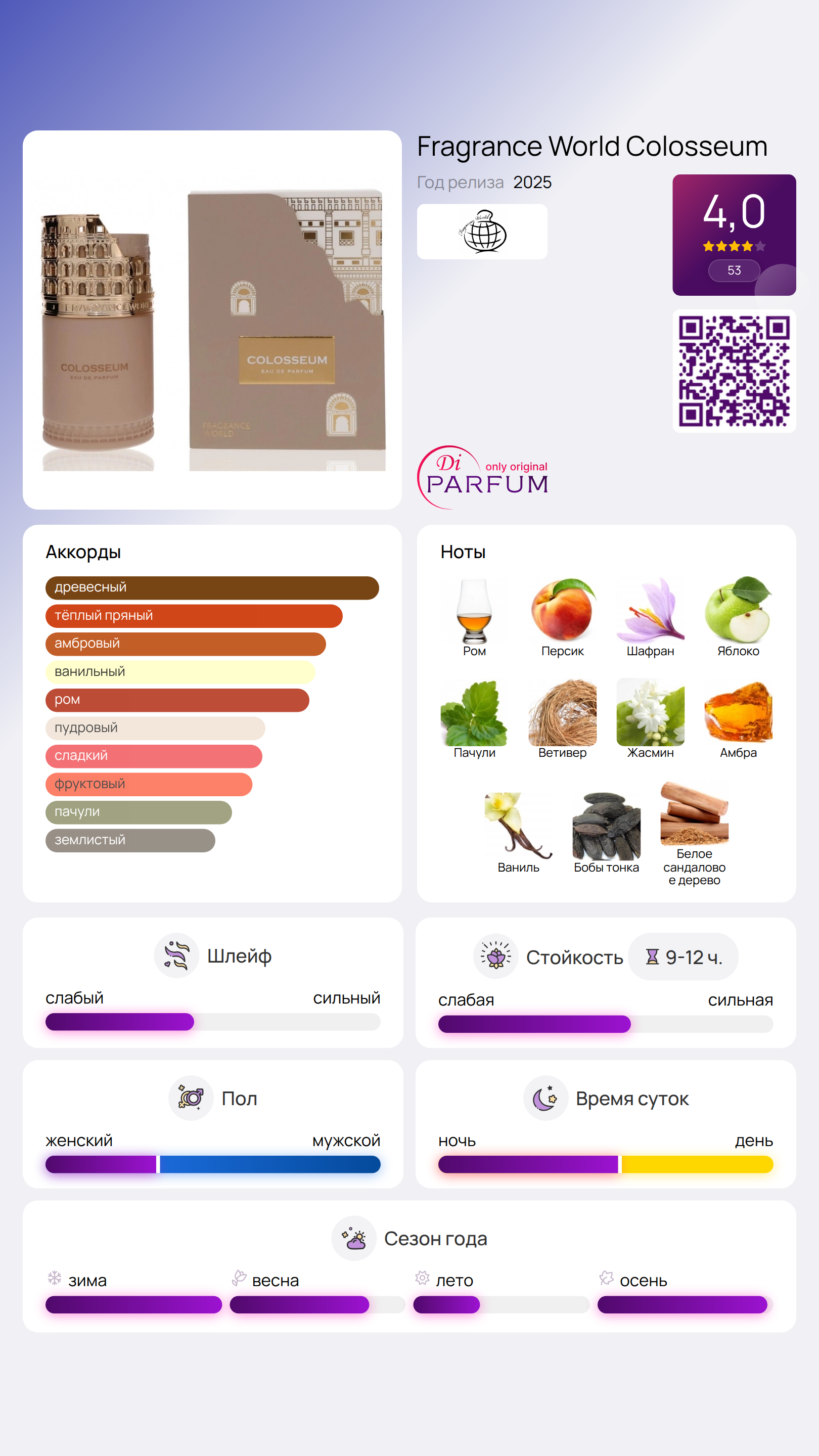 Colosseum от Fragrance World - это восточный древесный аромат для женщин и мужчин, который открывает новые горизонты в мире парфюмерии. Выпущенный в 2025 году, этот новый аромат уже завоевывает популярность благодаря своей уникальной композиции и многообразию нот.