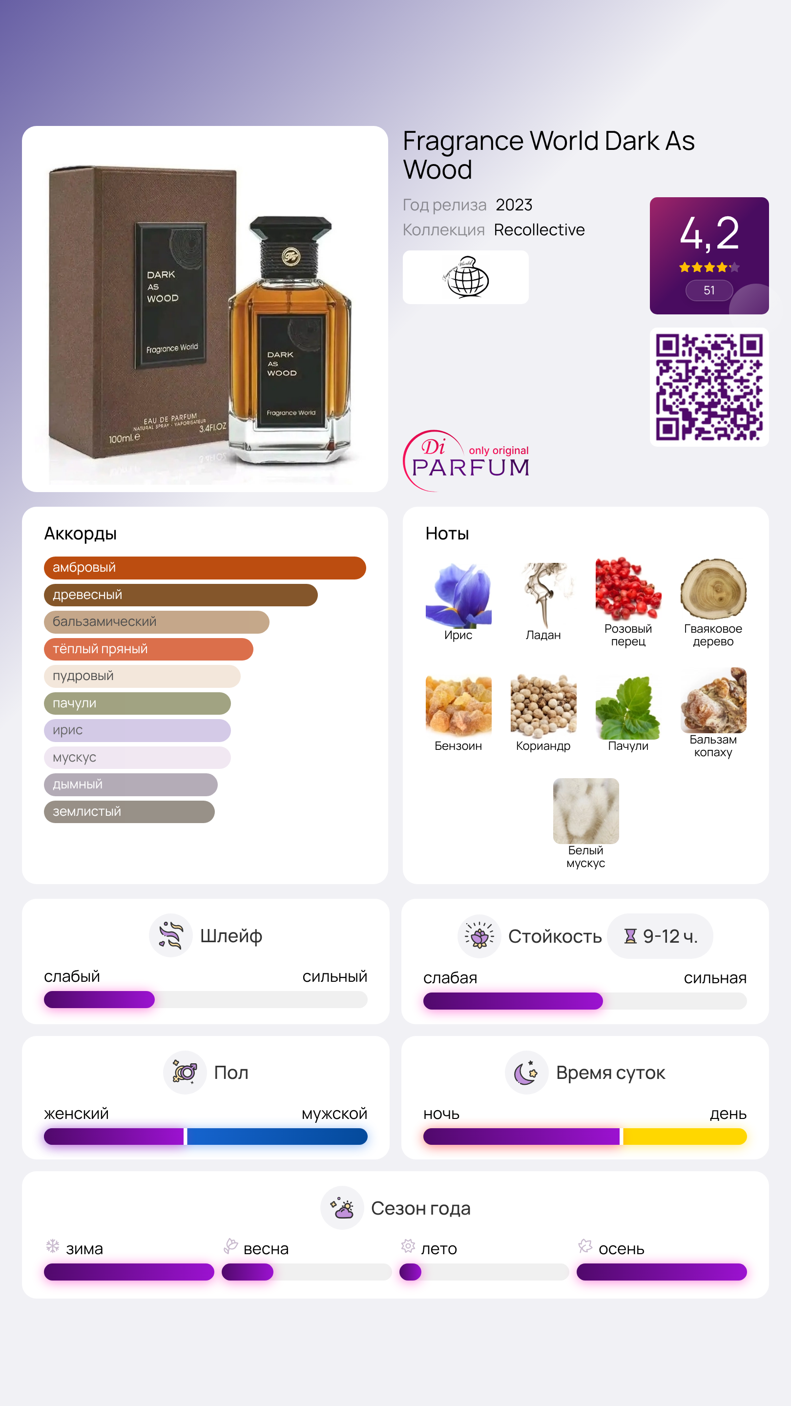 Dark As Wood от Fragrance World – это восточно-древесный аромат, предназначенный как для женщин, так и для мужчин. Он был представлен на рынке в 2023 году и сразу завоевал популярность благодаря своей уникальной гармонии нот.