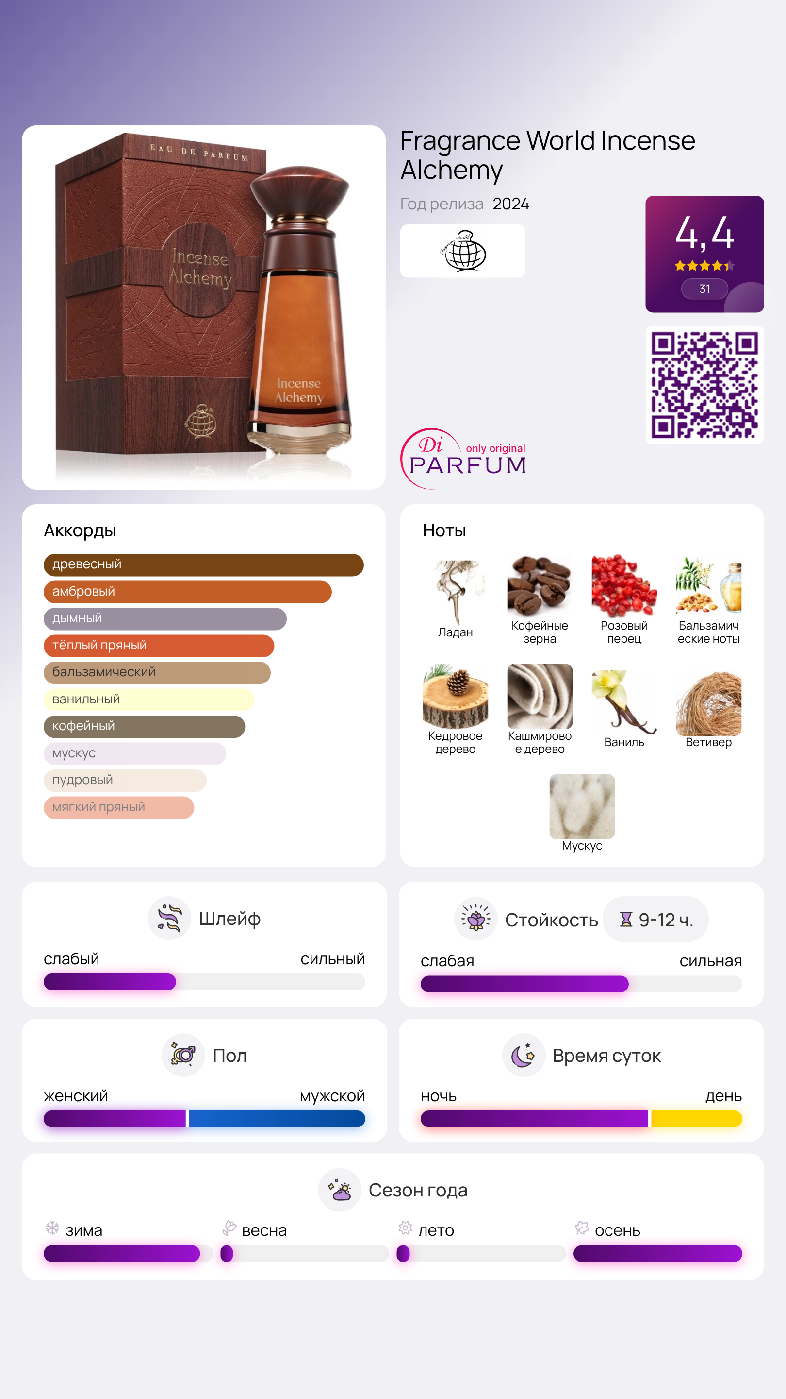 В сердце аромата звучит нежный ладан, окутанный нотами крепкого кофе и пикантного розового перца. Бальзамические ноты добавляют теплоту и чувственность, плавно переходя к древесным аккордам кашемирового дерева и кедра. Завершают композицию сладкие оттенки ванили, глубокий ветивер и элегантный мускус.