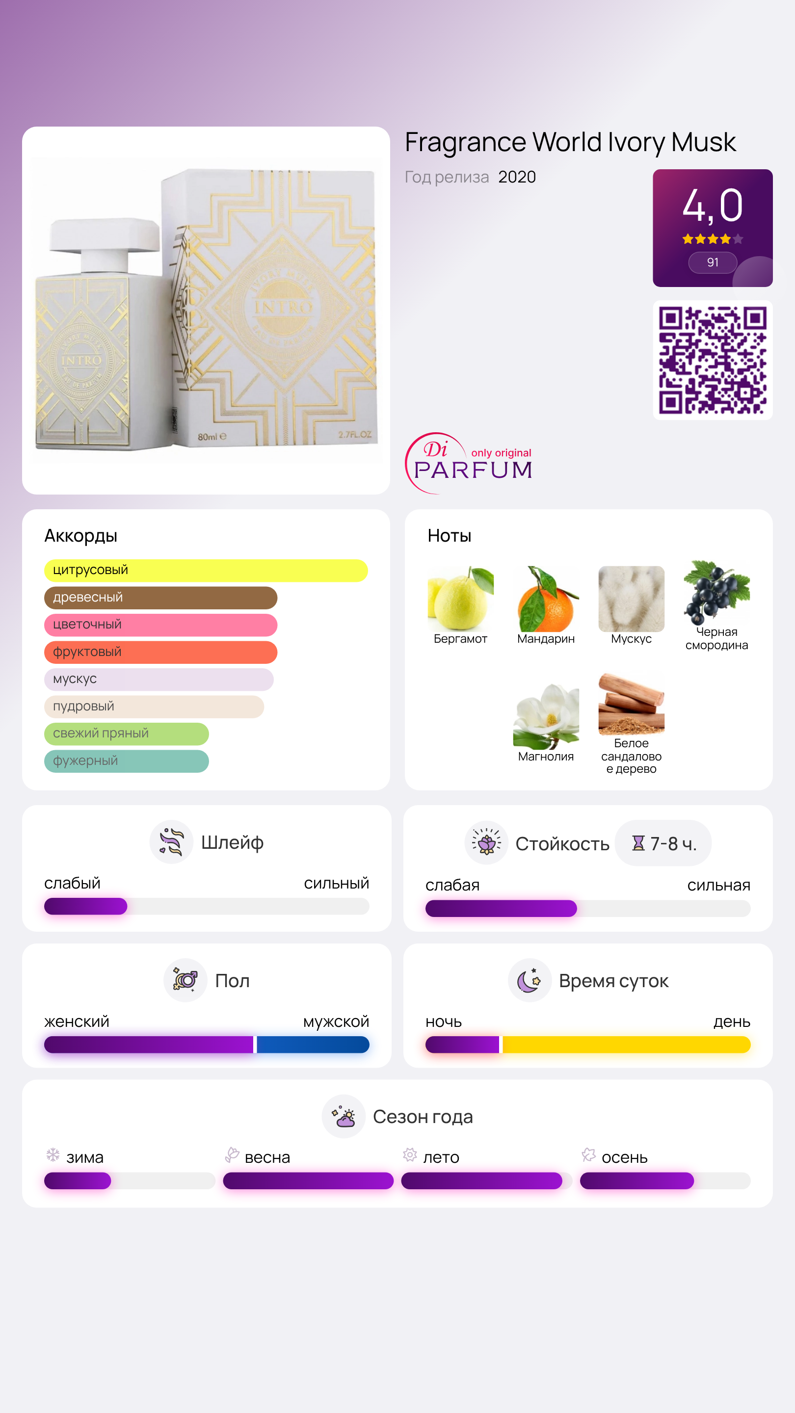 Ivory Musk от Fragrance World — это изысканный цветочно-древесный мускусный аромат, предназначенный как для женщин, так и для мужчин. Выпущенный в 2020 году, этот парфюм пленяет своим уникальным сочетанием нот, создавая выразительный и многогранный аромат.