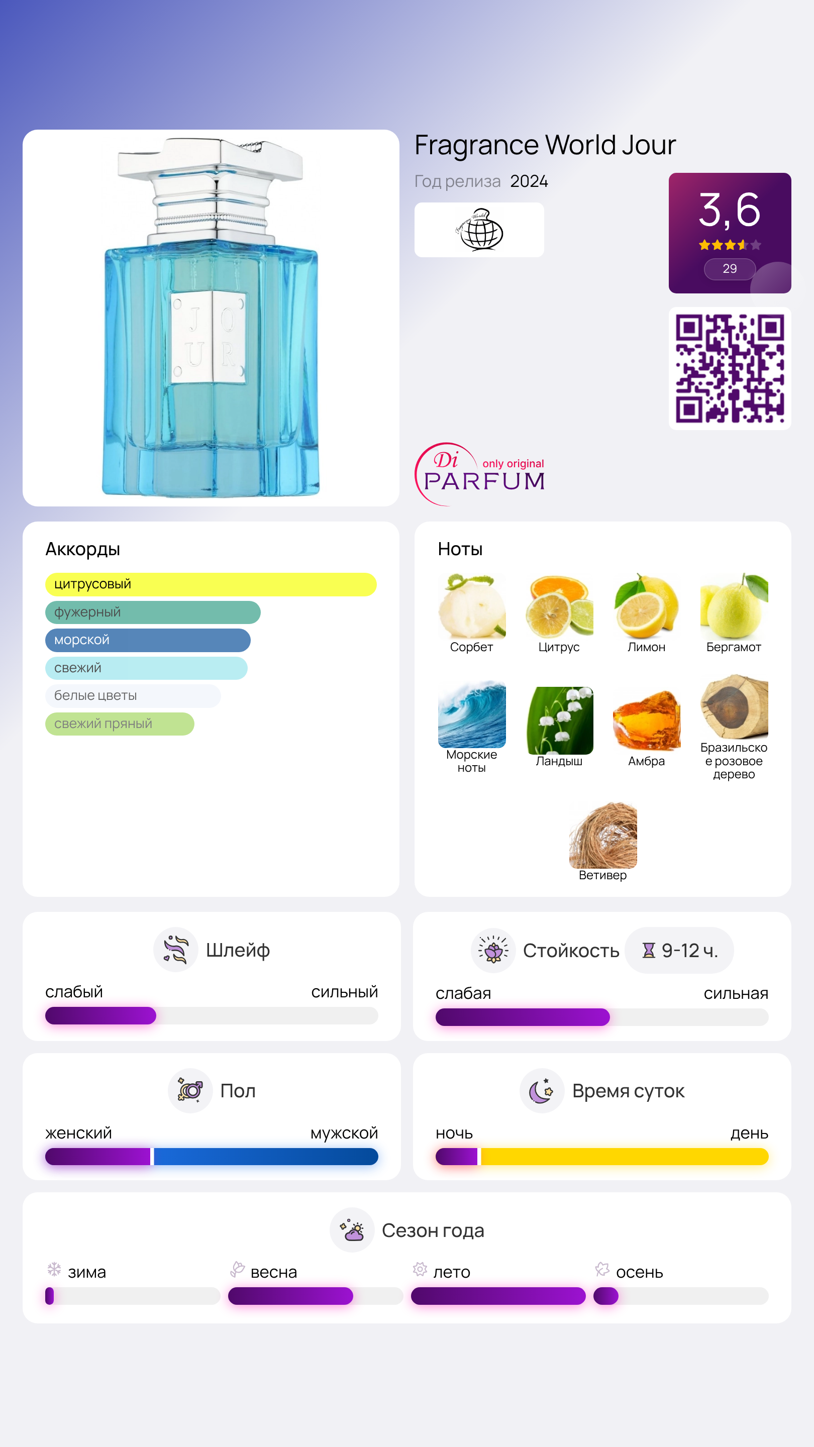 Парфюм Jour от ближневосточного бренда Fragrance World появился в 2024 году как часть коллекции Citric Hours. Этот унисекс аромат обладает свежим и легким характером. В его составе прекрасно сочетаются бодрящие ноты цитрусов и теплые древесные аккорды, что вызывает ассоциации с популярным Light Blue Eau Intense от Dolce & Gabbana.