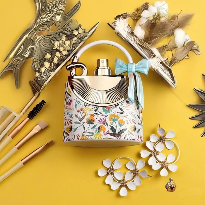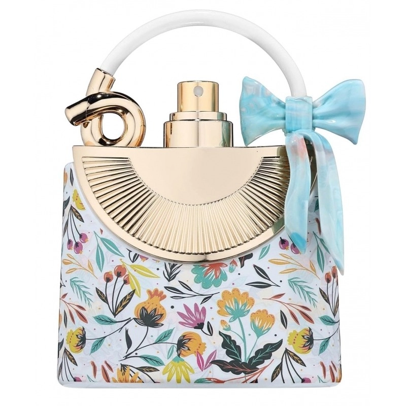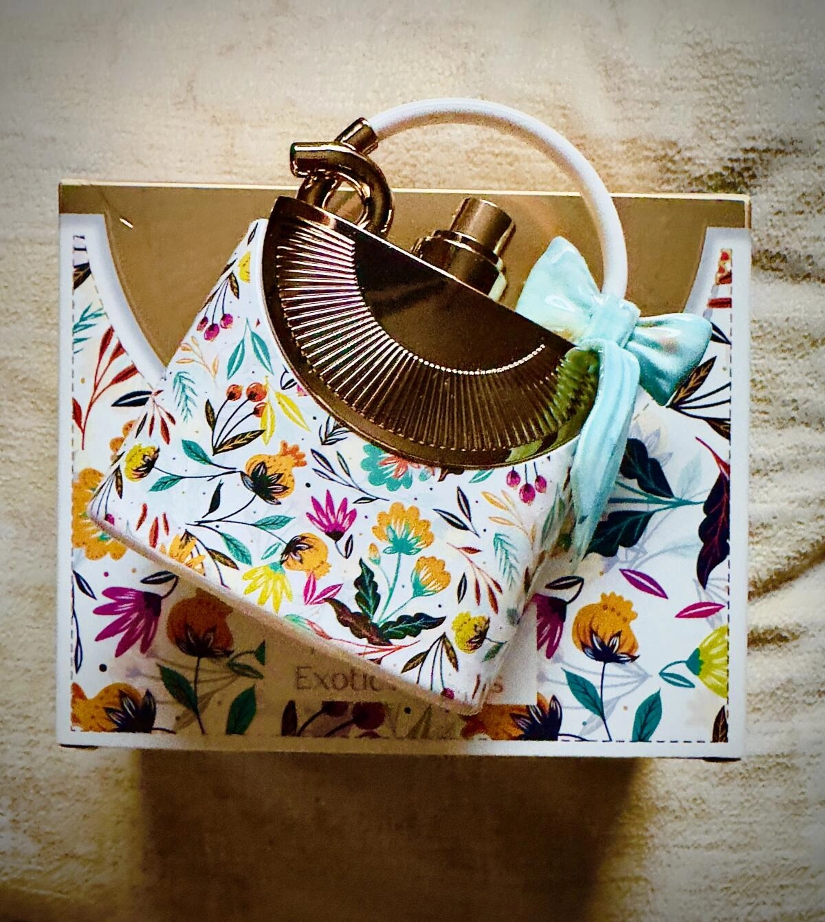 Парфюмерная новинка для женщин от Fragrance World, названная Nudo Exotic Flowers, представляет собой истинное очарование с первых моментов. Даже не зная, что находится внутри, любая дама не сможет не заметить изящный флакон, выполненный в форме дамской сумочки с цветочками и симпатичным бантом. Он полон прелести и утонченности.