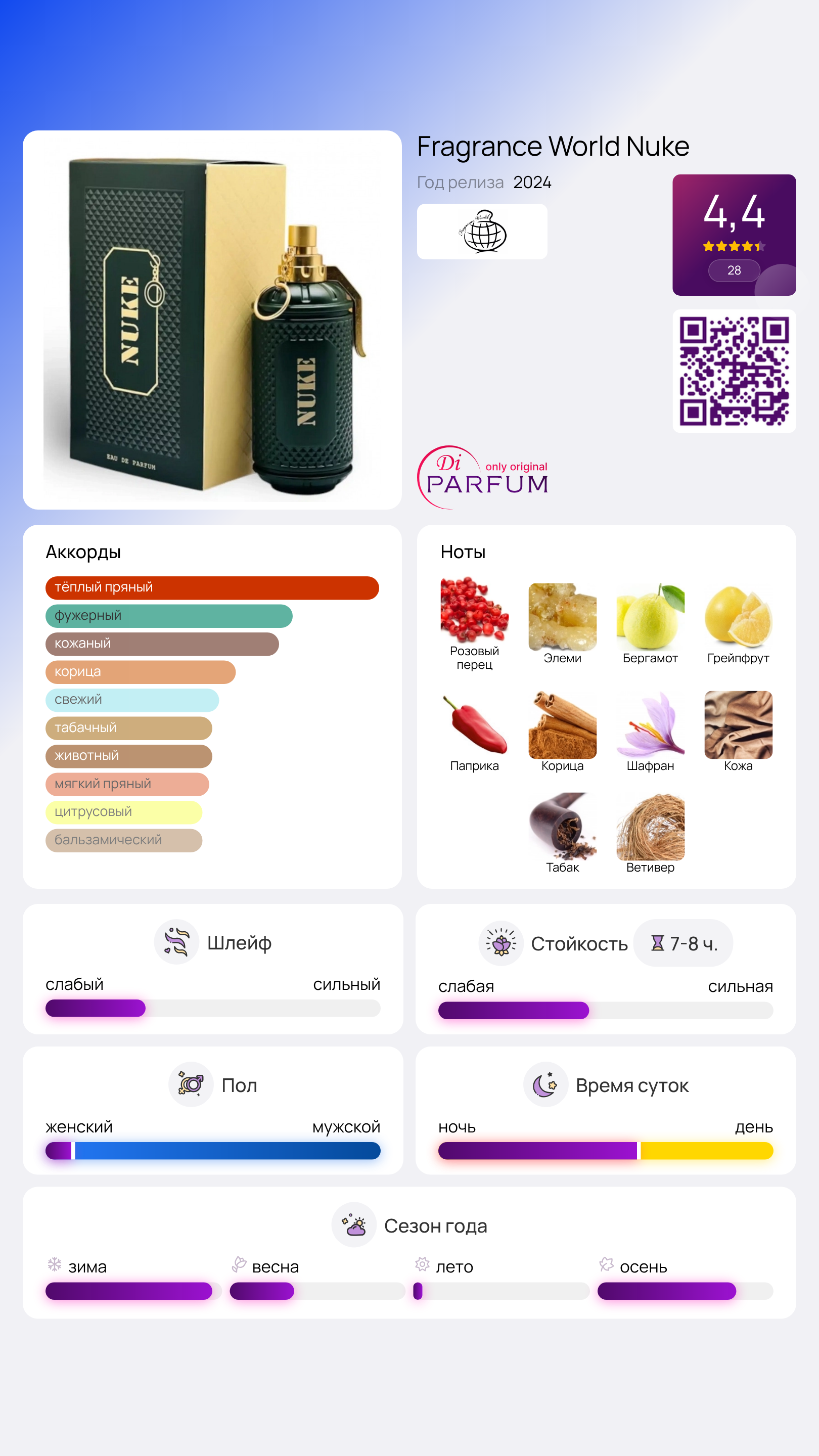Аромат для мужчин под названием Nuke отличается своей притягательностью и смелостью, соединяя в себе силу и энергию, характерные для истинных мужчин. В композиции органично переплетаются острые пряные аккорды и страстные кожаные ноты, создавая мощную мужественную основу. Звучание начинается с ярких нот элеми, которые переходят в горьковатые и терпкие оттенки грейпфрута и бергамота, приправленные легкой пикантностью ягод розового перца.