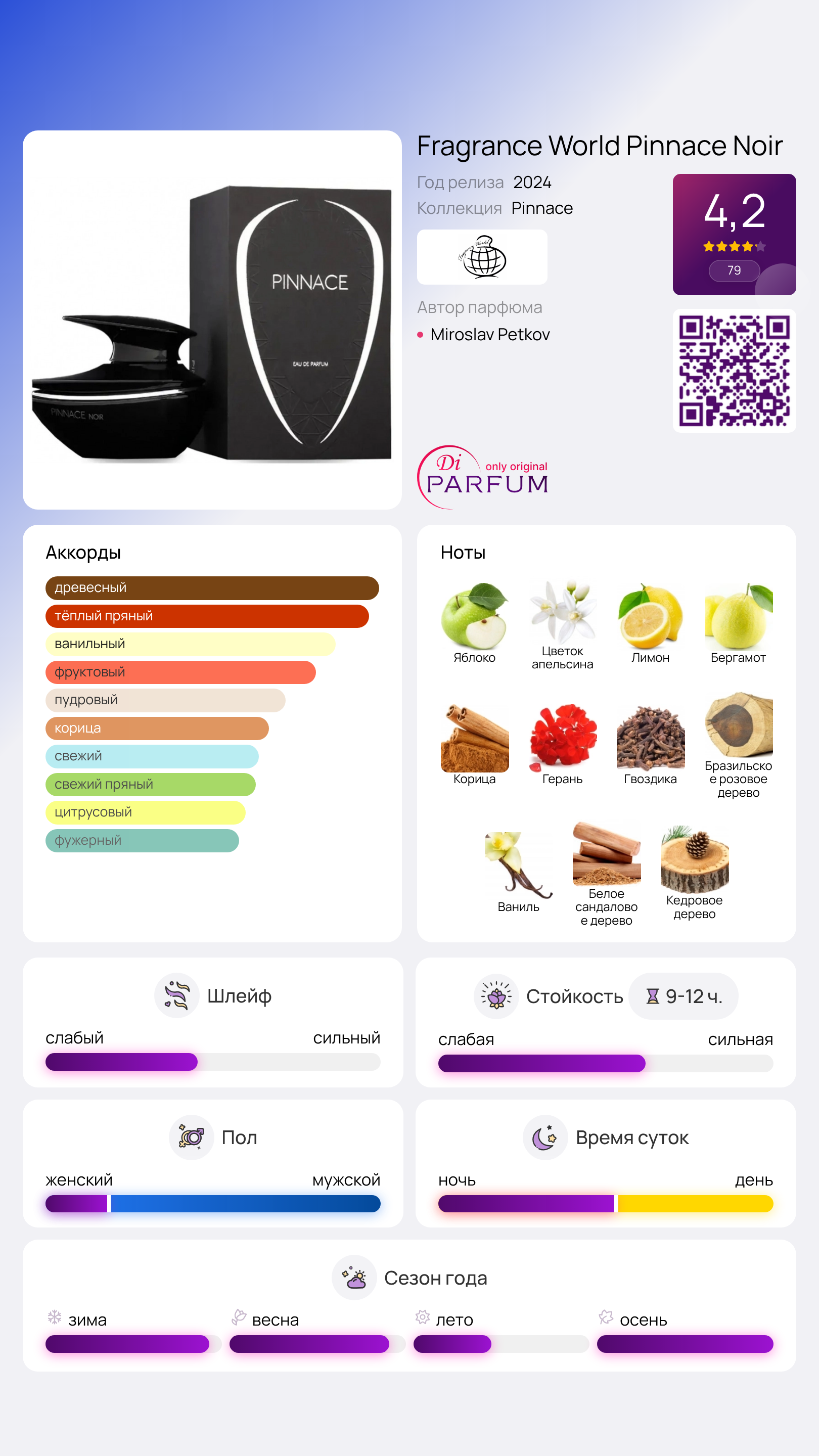 Завершает эту ароматическую симфонию изысканный древесный аккорд, состоящий из нот смолистого кедра и сливочного сандала, которые создают элегантную основу. Сладкая пудра ванили оставляет запоминающееся чувственное послевкусие. Fragrance World Pinnace Noir идеально подойдет для офисной обстановки благодаря отсутствию «агрессивных» нот, но его также можно использовать для создания запоминающегося вечернего образа, который несомненно произведет впечатление.