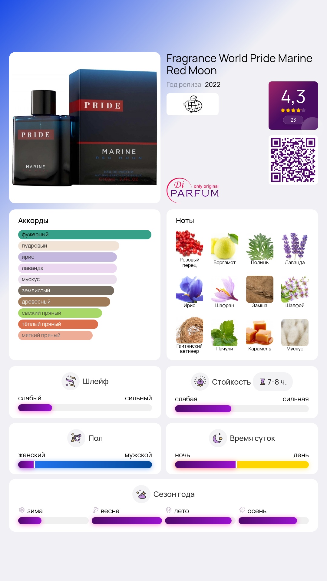 розовый перец, бергамот, полынь, лаванда, шафран, замша, шалфей, ирис, ветивер, пачули, карамель, мускус