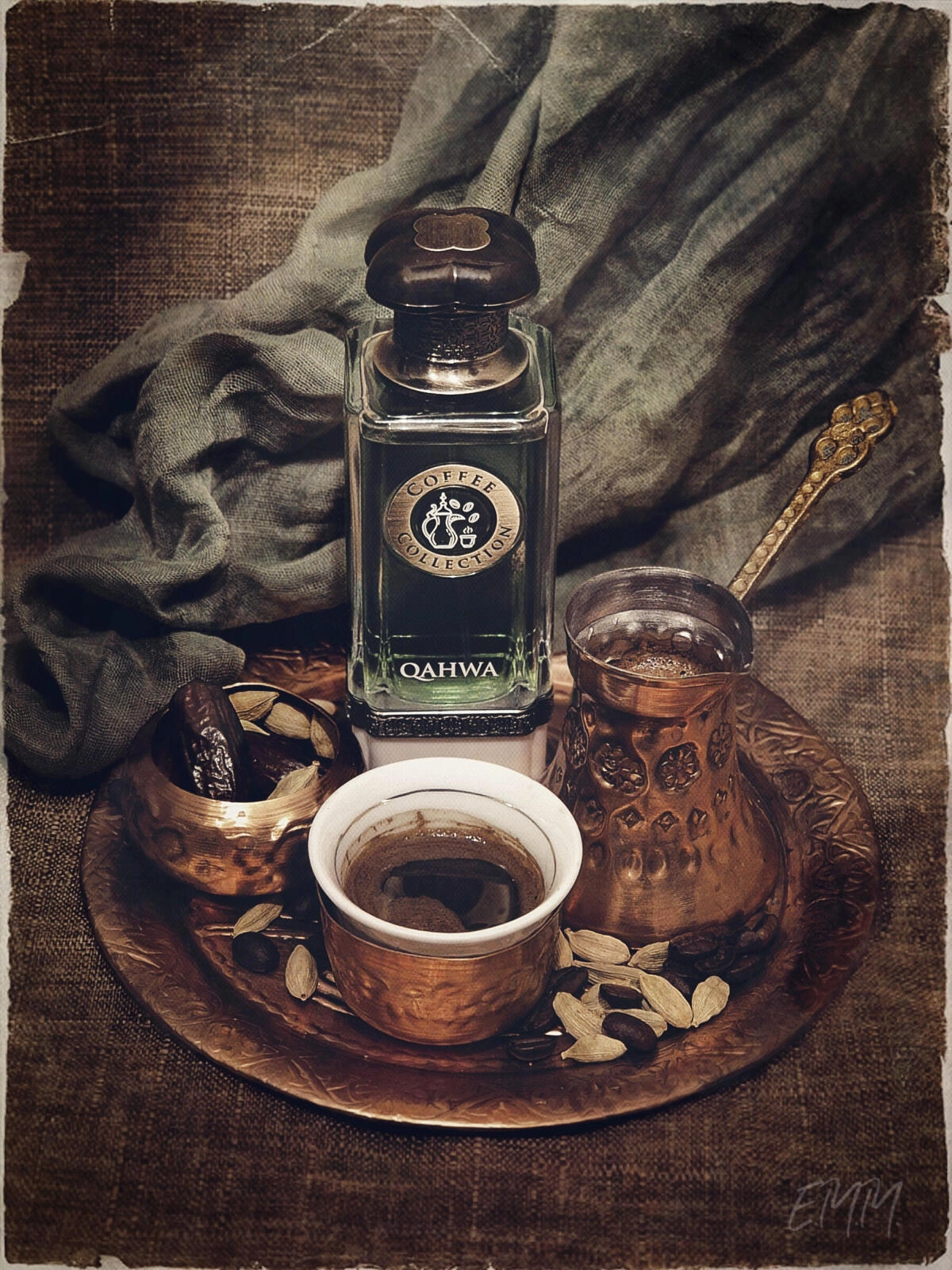 Qahwa вдохновлён культурой арабского кофе. Парфюм начинается с узнаваемого аромата кардамона, который создает пряную атмосферу. В сердце аромата раскрываются ноты жареного кофе в сочетании с тонким дымным аккордом и смолой лабданума. База парфюма наполняет вас теплой сладостью с аккордом фиников, кедром с Виргинии и смолой бензоина из Сиама, создавая неповторимый след.