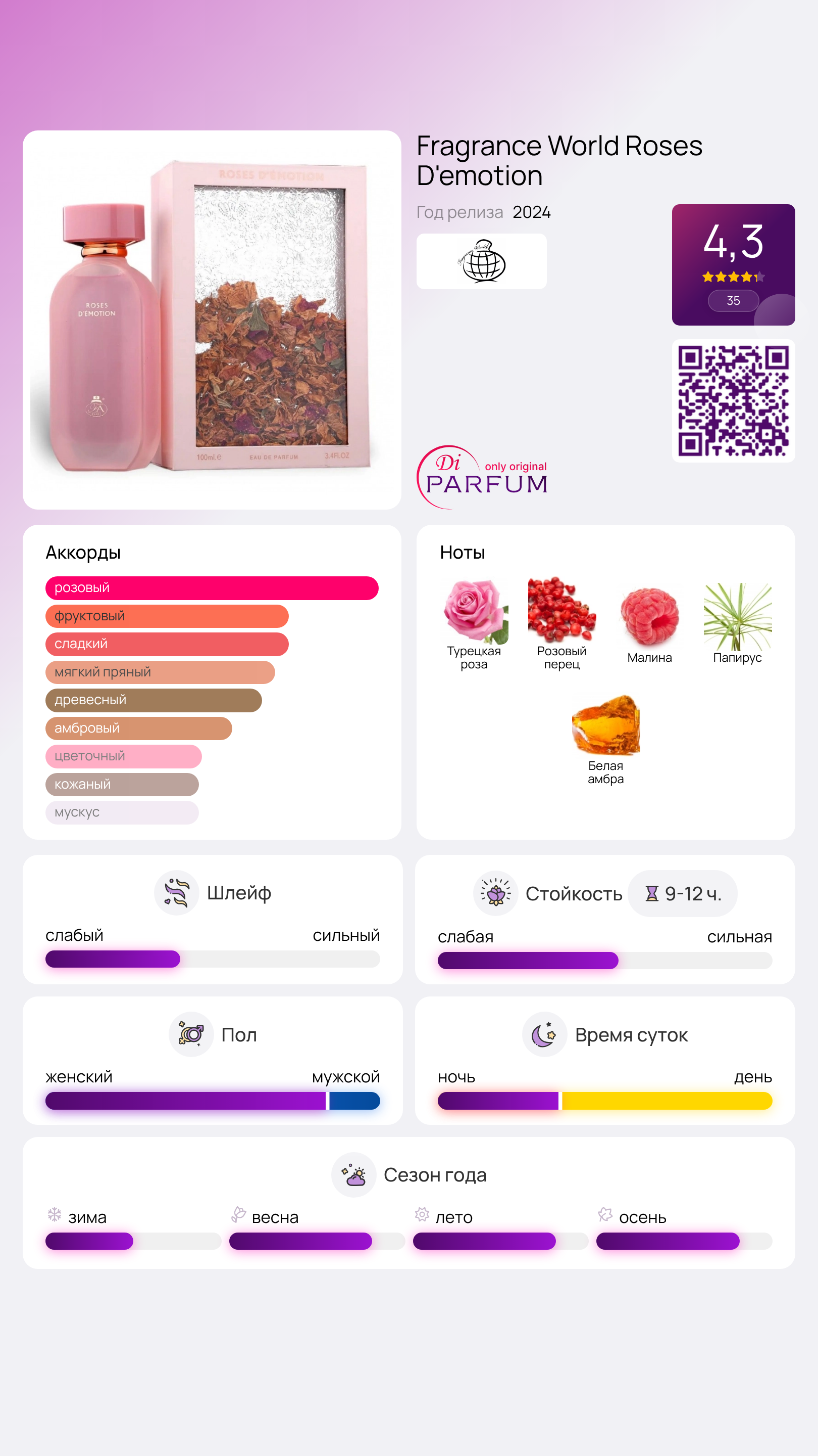 В этом аромате присутствуют фруктовые ноты, а малиновая феерия освежается розовым перцем. Бархатные лепестки создают удивительный шлейф с янтарной амброй, а фоном служит экзотика сухого папируса. Успокаивающий запах Roses D'emotion от Fragrance World предоставляет арабский бренд, известный своим качественным аналоговым парфюмом. Упакованное в нежно-розовый флакон, оно помещено в уникальную коробку, крышка которой усыпана высушенными лепестками роз.