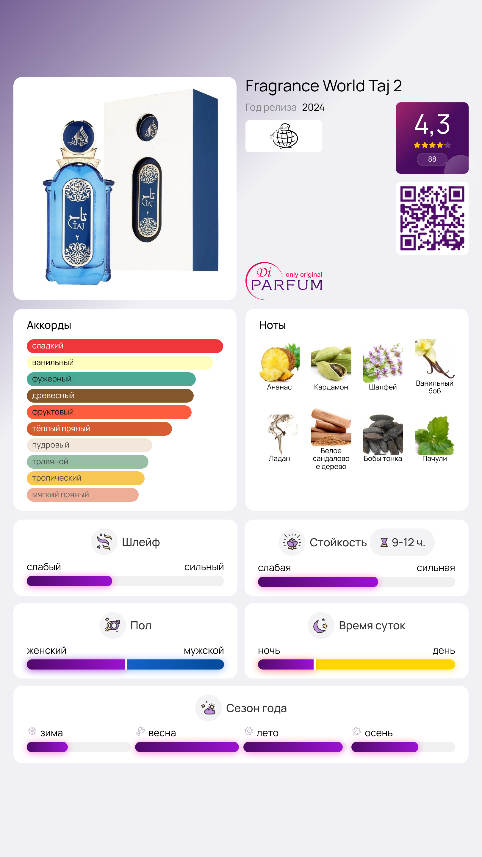 В сердце композиции ярко сверкает ананас, добавляя свежести и сочности, которая гармонично сочетается с пряным кардамоном и травянистым шалфеем. Эти ноты создают изящный баланс между фруктовой сладостью и пряной остротой. Завершают гармонию мягкая ваниль, загадочный ладан, теплый сандал и соблазнительные бобы тонка, что делает аромат поистине многогранным.