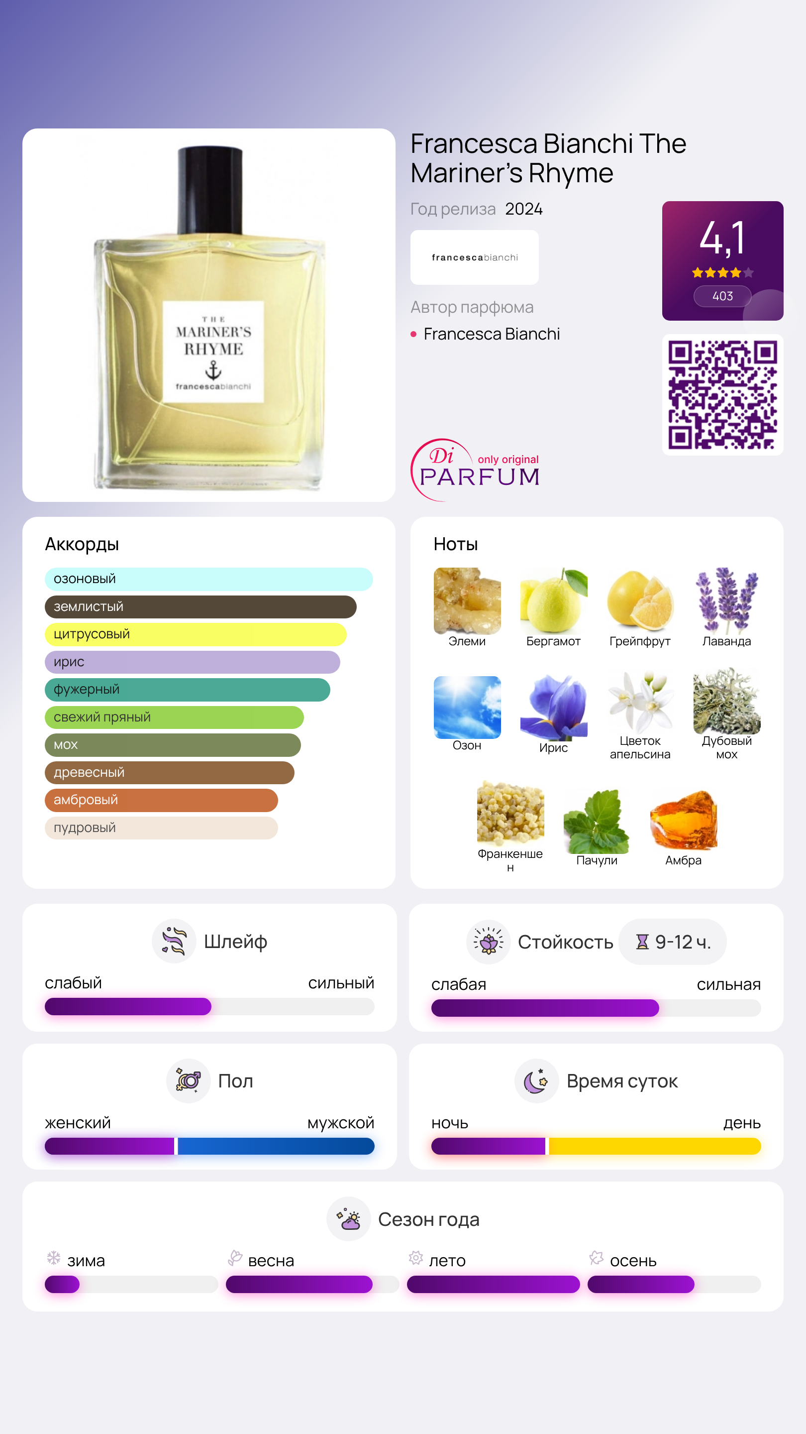 Эликсир Francesca Bianchi The Mariner's Rhyme способен вызвать размышления, погружая в созерцательное состояние. Этот акватический морской шипр черпает вдохновение из поэмы «Сказания о старом Мореходе», что придает аромату драматизм. Его экспериментальная структура передает ощущение путешествия по бурным морским просторам.