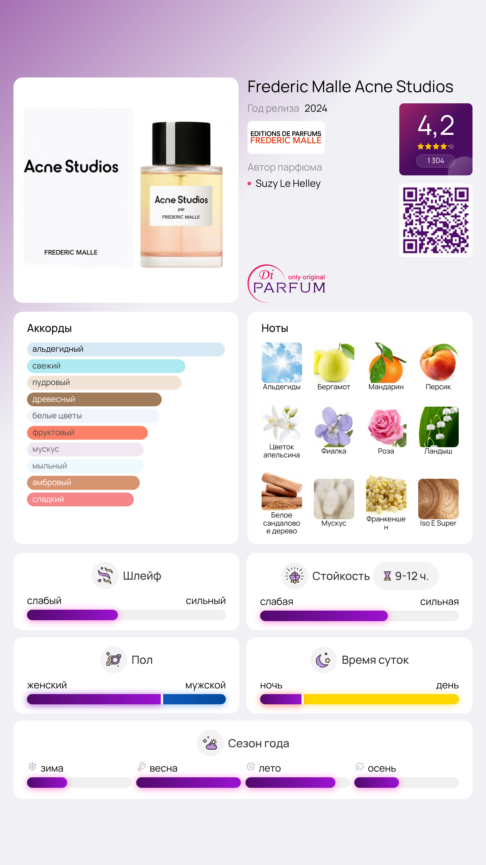 Фруктово-альдегидный аромат Frederic Malle для Acne Studios представляет собой живописный, оригинальный и уютный образец неоклассической парфюмерии. Он находится на стыке моды, искусства и ароматов, при этом обладая свежим и легким характером, без спортивного акцента. В нем заключена шведская элегантность, а также образы беззаботного детства, наполненного пастельными оттенками.