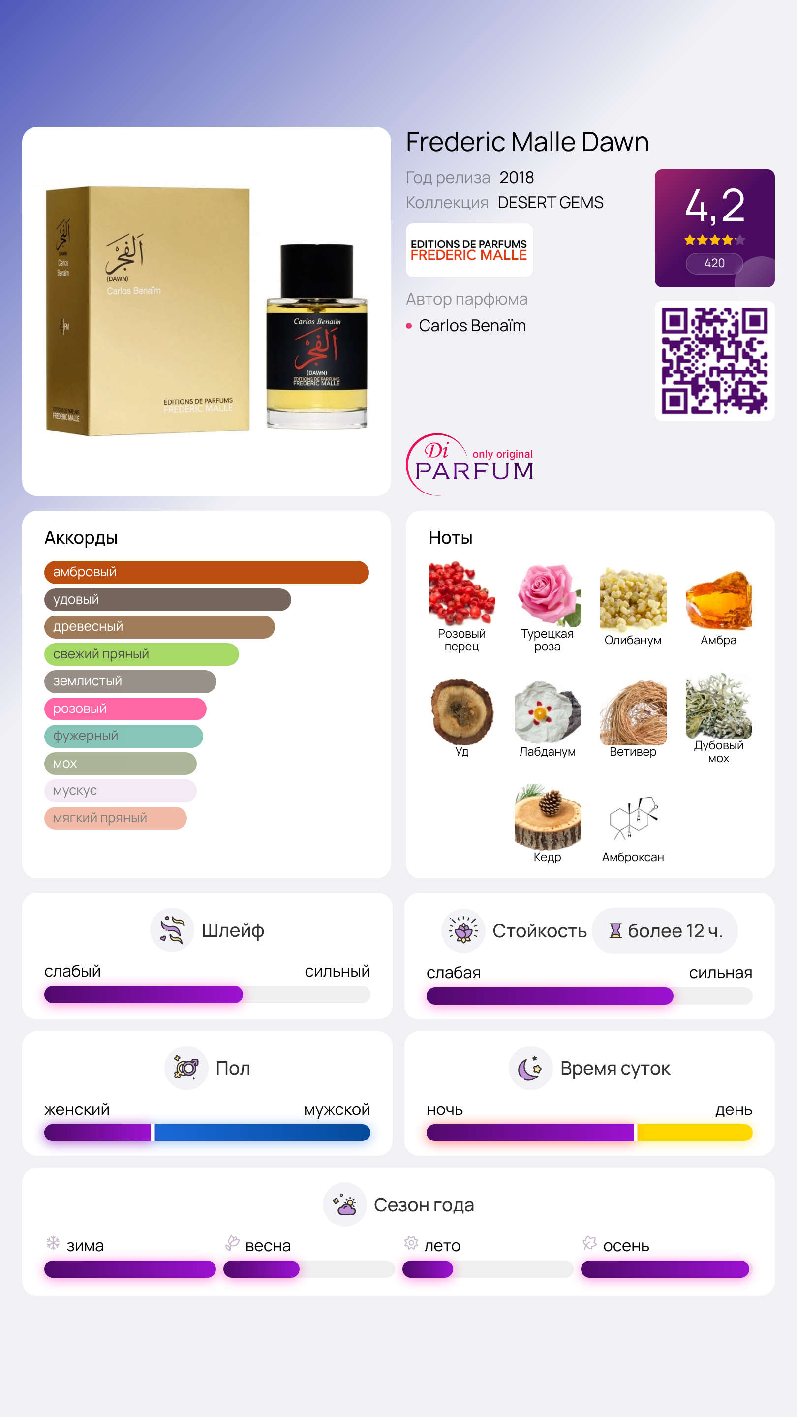 Dawn от Frederic Malle — это восточно-древесный аромат, созданный как для женщин, так и для мужчин. Он был представлен в 2018 году, а за его звучание отвечает талантливый парфюмер Карлос Бенаим. Эта композиция перенесет вас в мир утренней лёгкости и свежести, сочетая в себе яркие ноты, которые обволакивают и погружают в атмосферу романтики.