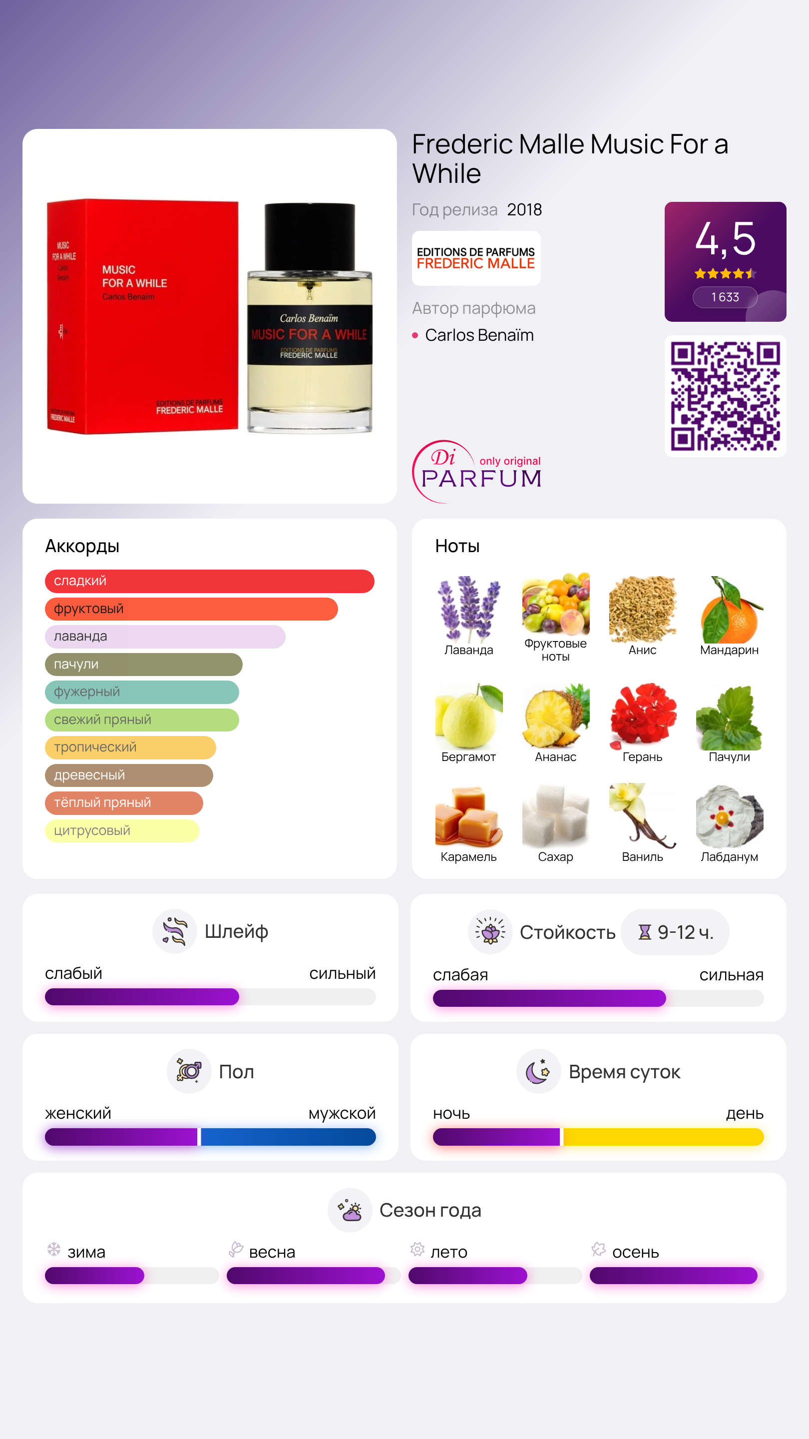 Известный французский бренд Editions de Parfums Frédéric Malle считается одним из ведущих в мире парфюмерии. Аромат Music for a While получил свое название в честь произведения английского композитора Генри Перселла. Живое, игривое и чувственное музыкальное произведение было перенесено в ольфакторную композицию, созданную носом Карлосом Бенаимом.